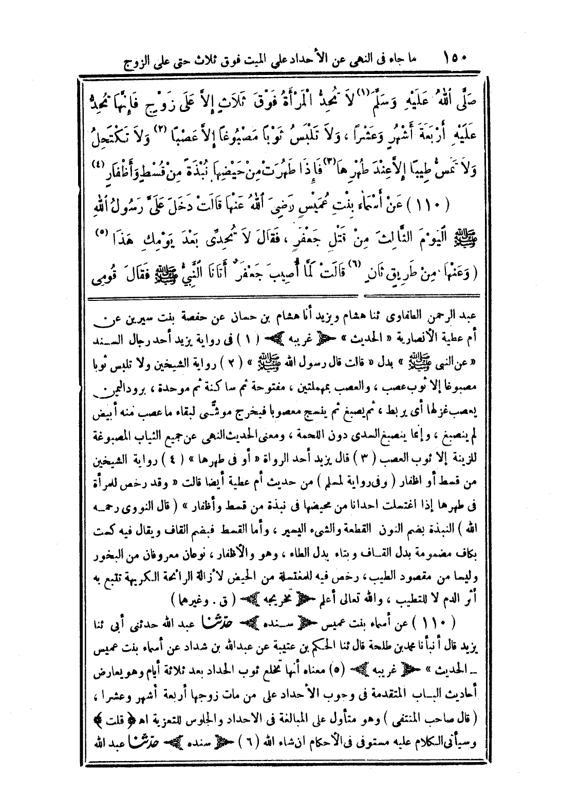(110) عن أسماء بنت عميس (سنده) حدّثنا عبد الله حدثنى أبى ثنا يزيد قال أنبأنا محمد بن طلحة قال ثنا الحكم بن عتيبة عن عبد الله بن شداد عن أسماء بنت عميس - الحديث" (غريبه) (5) معناه أنها تخلع ثوب الحداد بعد ثلاثة أيام وهو يعارض أحاديث الباب المتقدمة فى وجوب الأحداد على من مات زوجها أربعة أشهر وعشرا، (قال صاحب المنتفى) وهو متأول على المبالغة فى الاحداد للتعزية اهـ (قلت) وسيأتى الكلام عليه مستوفى فى الأحكام ان شاء الله (6) (سنده) حدثنا عبد الله