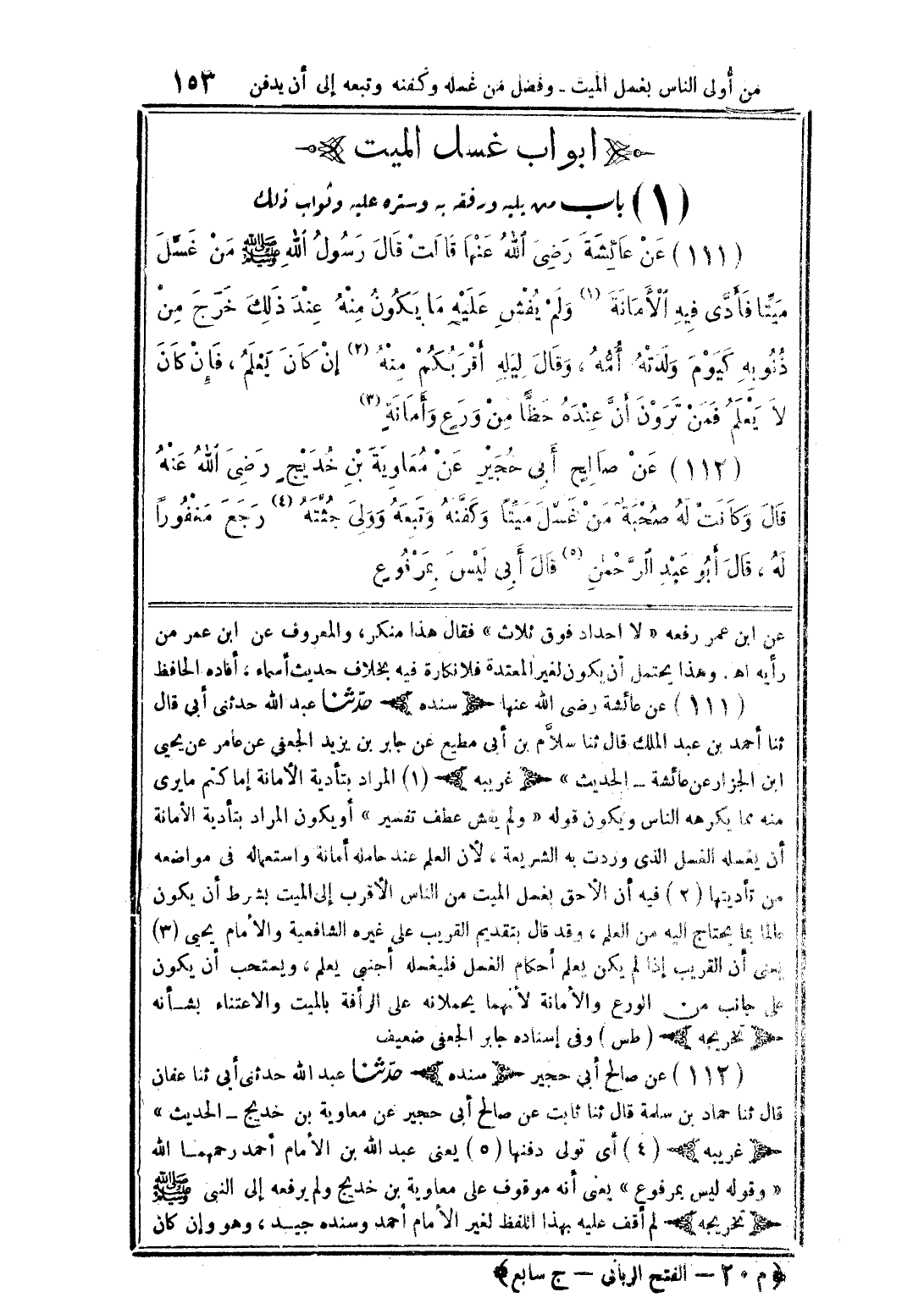 (111) عن عائشة رضي الله عنها قالت قال رسول الله صلي الله عليه وسلم من غسَّل ميتاً فأدَّى فيه الأمانة ولم يفش عليه ما يكون منه عند ذلك خرج من ذنوبه كيوم ولدته أمُّه، وقال ليله أقربكم منه إن كان يعلم، فإن كان لا يعلم فمن ترون أن عنده حظًّا من ورع وأمانة