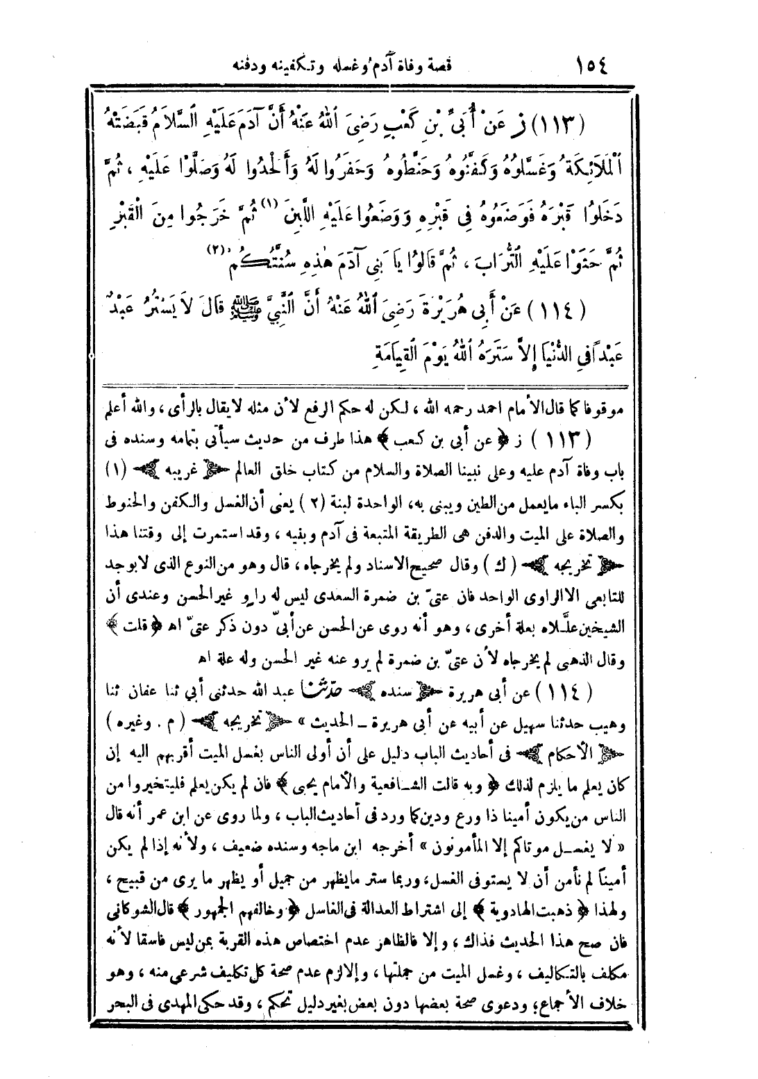 (113) ز عن أبي بن كعب رضي الله عنه أنَّ آدم عليه السَّلام قبضته الملائكة وغسَّلوه وكفنوه وحنطوه وحفروا له وألحدوا له وصلوا عليه، ثمَّ دخلوا قبره فوضعوه في قبره ووضعوا عليه اللبن ثمَّ خرجوا من القبر ثمَّ حثوا عليه التُّراب، ثم قالوا يا بني آدم هذه سنتكم