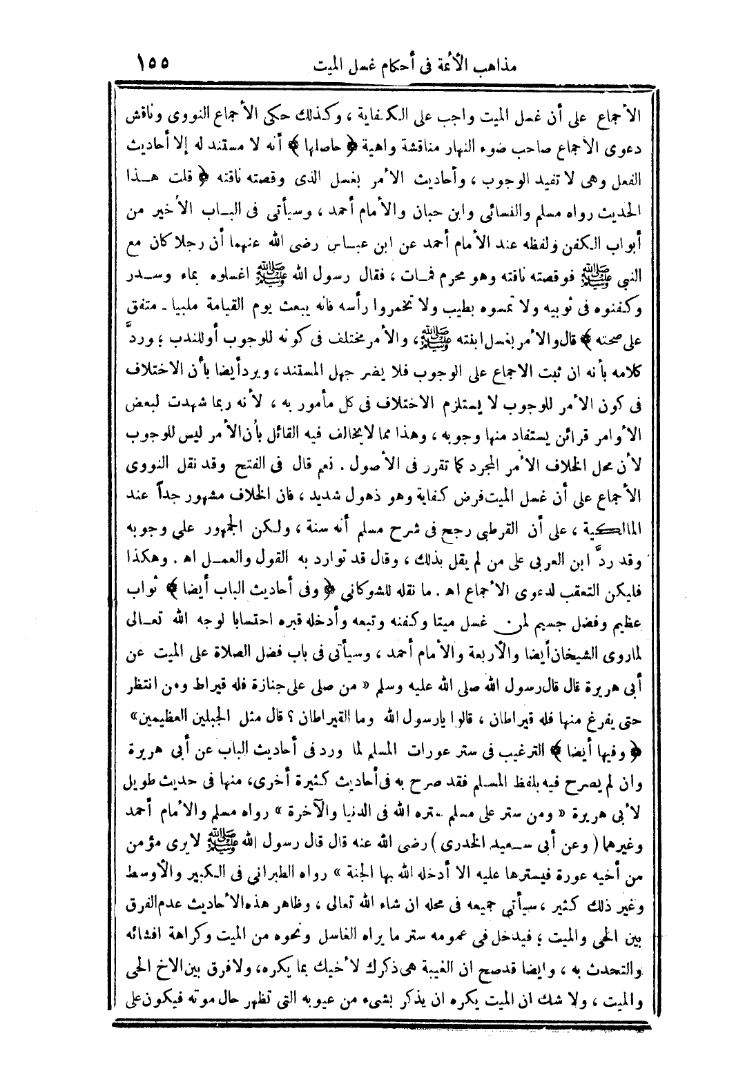 الإجماع على أن غسل الميت واجب على الكفاية، وكذلك حكى الأجماع النووي وناقش دعوى الأجماع صاحب ضوء النهار مناقشة واهية (حاصلها) أنه لا مستند له إلا أحاديث الفعل وهي لا تفيد الوجوب، وأحاديث الأمر بغسل الذي وقصته ناقته (قلت هذا الحديث رواه مسلم والنسائي وابن حبان والأمام أحمد، وسيأتي في الباب الأخير من أبواب الكفن وفظه عند الأمام أحمد عن ابن عباس رضي الله عنهما أن رجلا كان مع النبي صلى الله عليه وسلم فوقصته ناقته وهو محرم فمات، فقال رسول الله صلى الله عليه وسلم اغسلوه بماء وسدر وكفنوه في ثوبيه ولا تمسوه بطيب ولا تخمروا رأسه فانه يبعث يوم القيامة ملبيا - متفق على صحته) قال والأمر بغسل ابنته صلى الله عليه وسلم، والأمر مختلف في كونه للوجوب أو للندب؛ ورد كلامه بأنه أن ثبت الاجماع على الوجوب فلا يضر جهل المستند، ويرد أيضا بأن الاختلاف في كون الأمر للوجوب لا يستلزم الاختلاف في كل مأمور به، لأنه ربما شهدت لبعض الأوامر قرائن يستفاد منها وجوبه، وهذا مما لا يخالف فيه القائل بأن الأمر ليس للوجوب لأن محل الخلاف الأمر المجرد كما تقرر في الأصول. نعم قال في الفتح وقد نقل النووي الأجماع على أن غسل الميت فرض كفاية وهو ذهول شديد، فان الخلاف مشهور جداً عند المالكية، ابن العربي على من لم يقل بذلك، وقال قد توارد به القول والعمل اهـ. وهكذا فليكن التعقب لدءوى الأجماع اهـ. ما نقله للشوكاني (وفي أحاديث الباب أيضا) ثواب عظيم وفضل جسيم لمن غسل ميتا وكفنه وتبعه وأدخله قبره احتسابا لوجه الله تعالى لماروى الشيخان أيضا والأربعة والأمام أحمد، وسيأتي في بابا فضل الصلاة على الميت عن أبي هريرة قال قال رسول الله صلى الله عليه وسلم "من صلى على جنازة فله قيراط وءن انتظر حتى يفرغ منها فله قيراطان، قالوا يا رسول الله وما القيراطان؟ قال مثل الجبلين العظيمين" (وفيها أيضا) الترغيب في ستر عورات المسلم لما ورد في أحاديث الباب عن أبي هريرة وان لم يصرح فيه بلفظ المسلم فقد صرح به في أحاديث كثيرة أخرى، منها في حديث طويل لأبي هريرة "ومن ستر على مسلم ستره الله في الدنيا والآخرة" رواه مسلم والأمام أحمد وغيرهما (وعن أبي سعيد الخدري) رضي الله عنه قال قال رسول الله صلى الله عليه وسلم لا يرى مؤمن من أخيه عورة فيسترها عليه الا أدخله الله بها الجنة" رواه الطبراني في الكبير والأوسط وغير ذلك كثير، سيأتي جميعه في محله ان شاء الله تعالى، وظاهر هذه الأحاديث عدم الفرق بين الحي والميت، فيدخل في عمومه ستر ما يراه الغاسل ونحوه من الميت وكراهة افشائه والتحدث به، وايضا قد صح ان الغيبة عي ذكرك لأخيك بما يكره، ولا فرق بين الاخ الحي والميت، ولا شك ان الميت يكره ان يذكر بشيء من عيوبه التي تظهر حال موته فيكون على