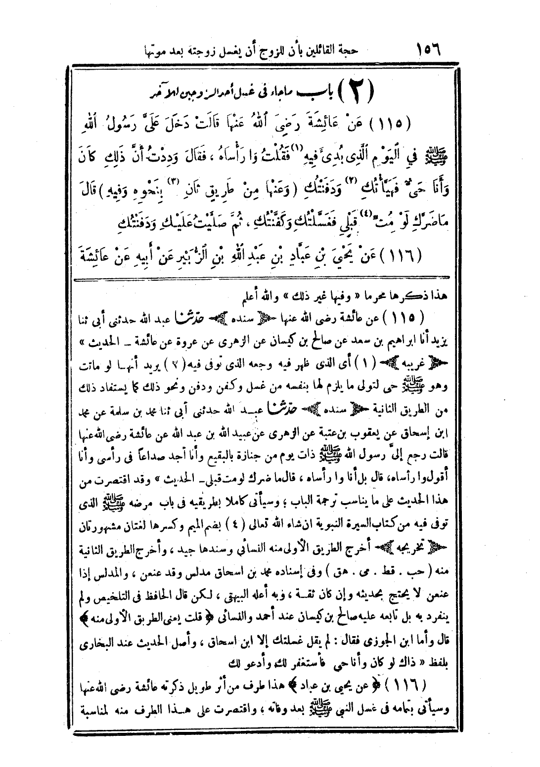 (115) عن عائشة رضي الله عنها (سنده) حدثنا عبد الله حدثني أبي ثنا يزيد أنا ابراهيم بن سمد عن صالح بن كيسان عن الزهري عن عروة عن عائشة - الحديث" (غريبة) (1) أي الذي ظهر فيه وجعه الذي توفي فيه (7) يريد أنها لو ماتت وهو صلى الله عليه وسلم حي لتولى ما يلزم لها بنفسه من غسل وكفن ودفن ونحو ذلك كما يستفاد ذلك من الطريق الثانية (سنده) حدثنا عبد الله حدثني أبي ثنا محمد بن سلمة عن محمد ابن إسحاق عن يعقوب بن عتبة عن الزهري عن عبيد الله بن عبد الله عن عائشة رضي الله عنها قال رجع إلى رسول اللله صلى الله عليه وسلم ذات يوم من جنازة بالبقيع وأنا أجد صداعاً في رأسي وأنا أقول وا رأساه، قال بل أنا وا رأساه، قال ما ضرك لو مت قبلي - الحديث" وقد اقتصرت من هذا الحديث على ما يناسب ترجمة الباب؛ وسيأتي كاملا بطريقية في باب مرضه صلى الله عليه وسلم الذي توفي فيه من كتاب الشيرة النبوية ان شاء الله تعالى (4) بضم الميم وكسرها لفتان مشهورتان (تخريجه) أخرج الطريق الأولى من النسائي وسندها جيد، وأخرج الطريق الثانية منه (حب. قط. مي. هق) وفي إسناده محمد بن إسحاق مدلس وقد عنعن، والمدلس إذا عنعن لا يحتج بحديثه وإن كان ثقة، وبه أعله البيهقي، لكن قال الحافظ في التلخيص ولم ينفرد به بل تابعه عليه صالح بن كيسان عند أحمد والنسائي (قلت يعني الطريق الأولى منه) قال وأنا ابن الجوزي فقال: لم يقل غسلتك إلا ابن اسحاق، وأصل الحديث عند البخاري بلفظ "ذاك لو كان وأنا حي فأستغفر لك وأدعو لك