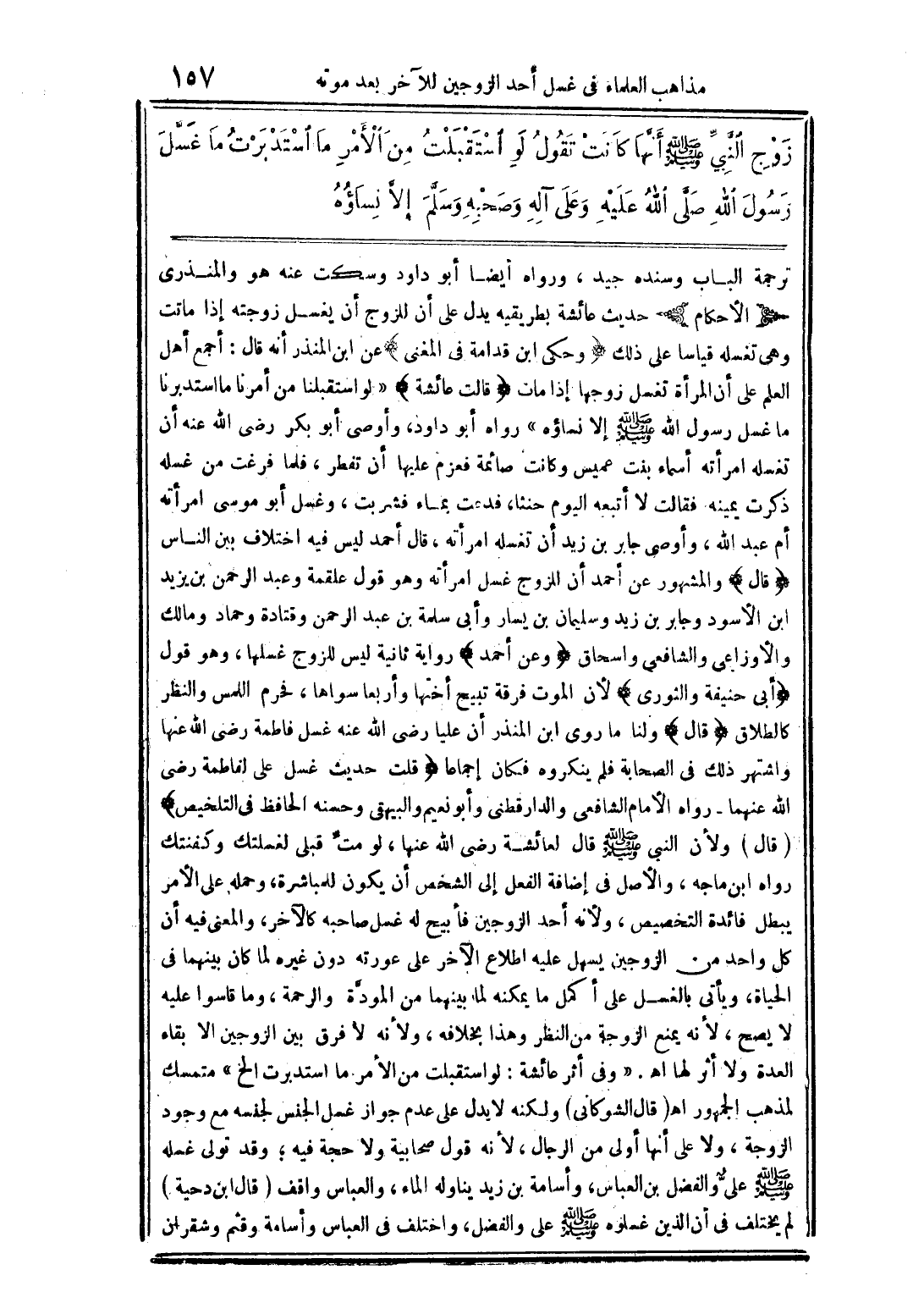 ترجمة الباب وسنجه جيد، ورواه أيضا أبو داود وسكت عنه هو والمنذري (الأحكام) حديث عائشة بطريقيه يدل على أن للزوج أن يغسل زوجته إذا ماتت وهي تعغسله قياسا على ذلك (وحكى ابن قدامة في المغني) عن ابن المنذر أن قال: أجمع أهل العلم على أن المرأة تغسل زوجها إذا مات (قالت عائشة) "لو استقبلنا من أمرنا ما استدبرنا ما غسل رسول الله صلى الله عليه وسلم إلا نساؤه" رواه أبو داود، وأوصى أبو بكر رضي الله عنه أن تغسله امرأته أسماء بنت عميس وكانت صائمة فعزم عليها أن تفطر، فلما فرغت من غسله ذكرت يمينه فقالت لا أتبعه اليوم حنئا، فدمت بماء فشربت، وغسل أبو موسى امرأته أم عبد الله، وأوصى جابر بن زيد أن تغسله امرأته، قال أحمد ليس فيه اختلاف بين الناس (قال) والمشهور عن أحمد أن الزوج غسل امرأته وهو قول علقمة وعبد الرحمن بن يزيد ابن الأسود وجابر بن زيد وسليمان بن يسار وأبي سلمة بن عبد الرحمن وقتادة وحماد ومالك والأوزاعي والشافعي واسحاق (وعن أحمد) رواية ثانية ليس للزوج غسلها، وهو قول (أبي حنيفة والنوري) لأن الموت فرقة تبيح أختها وأربعا سواها، فحرم اللمس والنظر كالطلاق (قال) ولنا ما روى ابن المنذر أ، عليا رضي الله عنه غسل فاطمة رضي الله عنه واشتهر ذلك في الصحابة فلم ينكروه فكان إجماعا (قلت حديث غسل علي لفاطمة رضي الله عنهما - رواه الأمام الشافعي والدار قطنى وأبو نعيم والبيهقي وحسنه الحافظ في التلخيص) (قال) ولأن النبي صلى الله عليه وسلم قال لعائشة رضي الله عنها، لو مت قبلي لغسلتك وكفنتك رواه ابن ماجه، والأصل في إضافة الفعل إلى الشخص أن يكون للمباشرة، وحمله على الأمر يبطل فائدة التخصيص، ولأنه أحد الزوجين فأبيح له غسل صاحبه كاآخر، والمعنى فيه أن كل واحد من الزوجين يسهل عليه اطلاع الآخر على عورته دون غيره لما كان بينهما في الحياة، ويأتي بالغسل على أكمل ما يمكنه لما بينهما من المودة والرحمة، وما قاسوا عليه لا يصح، لأنه يمنع الزوجة من النظر وهذا بخلافه، ولأنه لا فرق بين للزوجين الا بقاء العدة ولا أثر لها اهـ. "وفي أثر عائشة: لو استقبلت من الأمر ما استدبرت الخ" متمسك لمذهب الجمهور اهـ (قال الشوكاني) ولكنه لا يدل على عدم جواز غسل الجنس لجنسه مع وجود الزوجة، ولا على أنها أولى من الرجال، لأنه قول صحابيه ولا حجة فيه؛ وقد تولى غسله صلى الله عليه وسلم علي والفضل بن العباس، وأسامة بن زيد يناوله الماء، والعباس واقف (قال ابن دحية) لم يختلف في أن الذين غسلوه صلى الله عليه وسلم علي والفضل، واختلف في العباس وأسامة وقثم وشقران