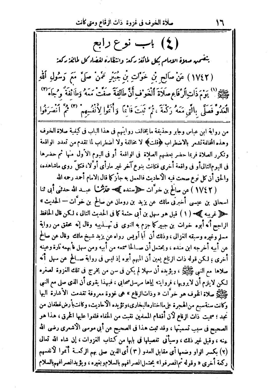 (1742) عن صالح بن حوَّات بن جبير عمن صلَّى مع رسول الله صلى الله عليه وسلم يوم ذات الرقاع صلاة الخوف أن طائفة صفَّت معه وطائفة وجاه العدوِّ فصلَّى بالَّتي معه ركعة، ثمَّ ثبت قائمًا وأتموا لأنفسهم ثمَّ انصرفوا