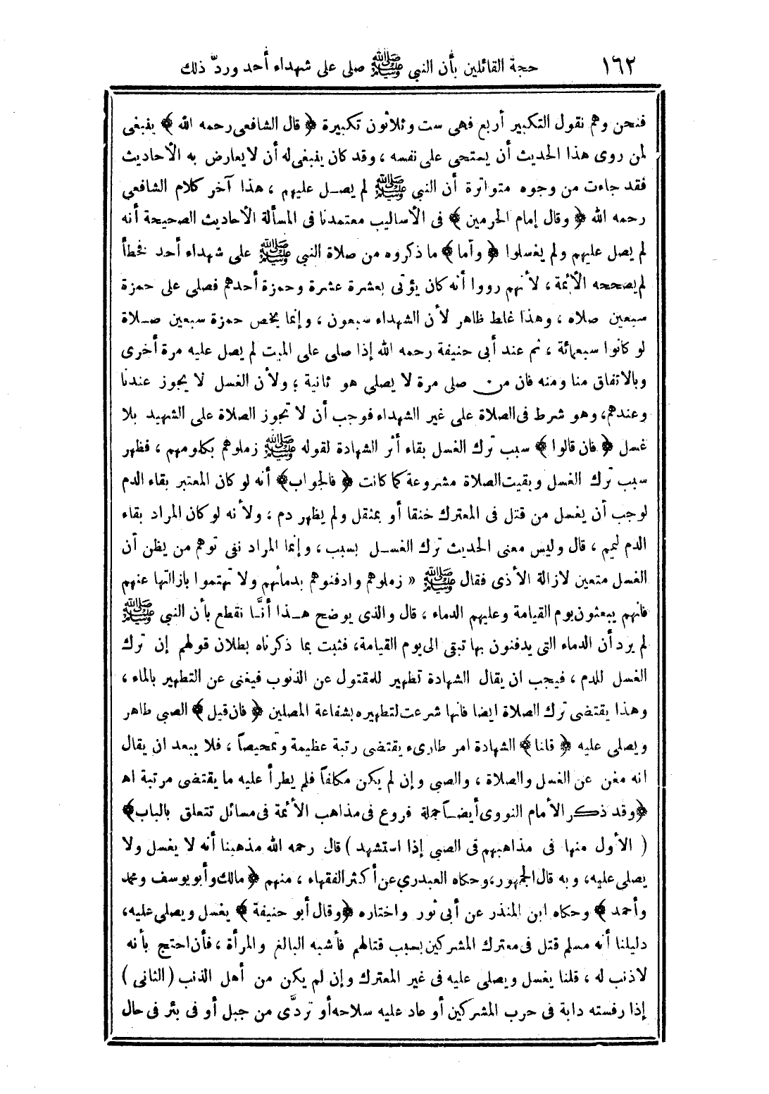فنحن وهم نقول التكبير أربع فهى ست وثلاثون تكبيرة (قال الشافعي رحمه الله) ينبغي لمن روى هذا الحديث أن يستحي على نفسه، وقد كان ينبغي له أن لا يعارض به الأحاديث فقد جاءت من وجوه متواترة أن النبي صلى الله عليه وسلم لم يصل عليهم، هذه آخر كلام الشافعي رحمه الله (وقال إمام الحرمين) في الأساليب معتمدنا في المسألة الأحاديث الصحيحة أنه لم يصل عليهم ولم يغسلوا (وأما) ما ذكروه من صلاة النبي صلى الله عليه وسلم على شهداء أحد فحطاً لم يصححه الأئمة، لأنهم رووا أنه كان يؤتي بعشرة عشرة وحمزة أحدهم فصلى على حمزة سبعين صلاه، وذا غلط ظاهر لأن الشهداء سبعون، وإنما يخص حمزة سبعين صلاة لو كانوا سبعمائه، ثم عند أبي حنيفة رحمه الله إذا صلى على الميت لم يصل عليه مرة أخرى وبالاتفاق منا ومنه فن من صلى مرة لا يصلى هو ثاتنية، ولأن الغسل لا يجوز عندنا وعندهم، وهو شرط في الصلاة على عير الشهداء فوجب أن لا تجوز الصلاة على الشهي بلا غسل (فان قالوا) سبب ترك الغسل بقاء أثر الشهادة لقوله صلى الله عليه وسلم زملوهم بكلومهم، فظهر سبب ترك الغسل وبقيت الصلاة مشروعة كما كانت (فالجواب) أنه لو كان المعتبر بقاء الدم لوجب أن يغسل من قتل في المعترك خنقا أو بمنقل ولم يظهر دم، ولأنه لو كان المراد بقاء الدم لميم، قال وليس معنى الحديث ترك الغسل بسبب، وإنما المراد نفى توهم من يظن أن الغسل متعين لازالة الأذى فقال صلى الله عليه وسلم "زملوهم وادفنوهم بدمائهم ولا تهتموا بازالتها عنهم ظنهم يبعثون يوم القيامة وعليهم الدماء، قال والذي يوضح هذا أنا نقطع بأن النبي صلى الله عليه وسلم لم يرد أن الدماء التي يدفنون بها تبقى إلى يوم القيامة، فثبت بما ذكرناه بطلان قولهم إن ترك الغسل للدم، فيجب ان يقال الشهادة تطهير للمقتول عن الذنوب فيغنى عن التطهير بالماء، وهذا يقتضى ترك الصلاة ايضا فانها شرعت لتطهيره بشفاعة المصلين (فان قيل) الصبي طاهر ويصلى عليه (قلنا) الشهادة امر طارئ يقتضى رتبة عظيمة وتمحيصاً، فلا يبعد ان يقال انه مغن عن الغسل والصلاة، والصبي وإن لم يكن مكلفاً فلم يطرأ عليه ما يقتضي مرتبه اهـ (وقد ذكر الأمام النووى أيضاً جملة فروع في مذاهب الأئمة في مسائل تتعلق بالباب) (الأول منها في مذاهبهم في الصبى إذا استشهد (قال رحمه الله مذهبنا أنه لا يغسل ولا يصلى عليه، وبه قال الجمهور، وحكاه العبدرى عن أكثر الفقهاء، منهم (مالك وأبو يوسف ومحمد وأحمد) وحكاه ابن المنذر عن أبي ثور واختاره (وقال أبو حنيفة) يغسل ويصلى عليه، دليلنا أنه مسلم قتل في معترك المشركين بسبب قتالهم فأشبه البالغ والمرأة، فأن احتج بأنه لا ذنب له، قلنا يغسل ويصلى عليه في غير المعترك وإن لم يكن من أهل الذئب (الثاني) إذا رفسته دابة في حرب المشركين أو عاد عليه سلاحه أو تردى من جبل أو في بئر في حال