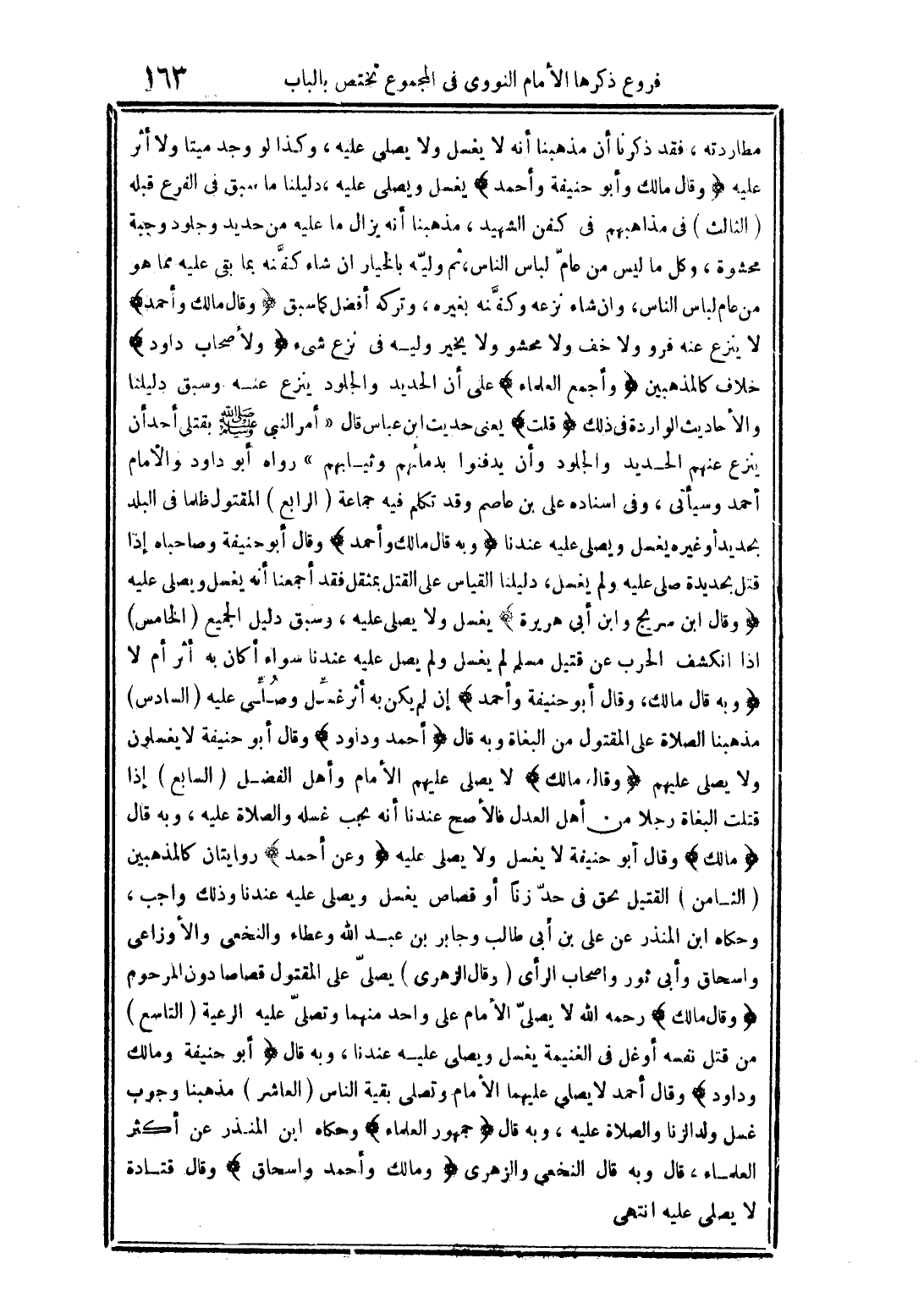 مطاردته، فقد ذكرنا أن مذهبنا أنه لا يغسل ولا يصلى عليه، وكذا لو وجد ميتا ولا أثر عليه (وقال مالك وأبو حنيفة وأحمد) بغسل ويصلى عليه، دليلنا ما سبق في الفرع قبله (الثالث) في مذاهبهم في كفن الشهيد، مذهبنا أنه يزال ما عليه من حديد وجلود وجبة محشوة، وكل ما ليس من عام لباس الناس، ثم وليه بالخيار ان شاء كفنه بما بقى عليه مما هو من عام لباس الناس، وان شاء نزعه وكفنه بغيره، وتركه أفضل كما سبق (وقال مالك وأحمد) لا ينزع عنه فرو ولا خف ولا محشو ولا يخير وليه في نزع شيء (ولأصحاب داود) خلاف كالمذهبين (وأجمع العلماء) على أن الحديد والجلود ينزع عنه وسبق دليلنا والأحاديث الواردة في ذلك (قلت) يعني حديث ابن عباس قال "أمر النبي صلى الله عليه وسلم بقتلى أحد أن ينزع عنهم الحديد والجلود وأن يدفنوا بدمائهم وثيابهم" رواه أبو داود والأمام أحمد وسيأتي، وفي اسناده على بن عاصم وقد تكلم فيه جماعة (الرابع) المقتول ظلما في البلد بحديداً وغيره يغسل ويصلى عليه عندنا (وبه قال مالك وأحمد) وقال أبو حنيفة وصاحباه إذا قتل بحديدة صلى عليه ولم يغسل، دليلنا القياس على القتل بمثقل أجعنا أنه يغسل ويصلى عليه (وقال ابن سريج وابن أبى هريرة) يغسل ولا يصلى عليه، وسبق دليل الجميع (الخامس) اذا انكشف الحرب عن قتيل مسلم لم يغسل ولم يصل عليه عندنا سواء أكان به أثر أم لا (وبه قال مالك، وقال أبو حنيفة وأحمد) إن لم يكن به أثر غسل وصلى عليه (السادس) مذهبنا الصلاة على المقتول من البغاة وبه قال (أحمد وداود) وقال أبو حنيفة لا يغسلون ولا يصلى عليهم (وقال مالك) لا يصلى عليهم الأمام وأهل الفضل (السابع) إذا قتلت البغاة رجلا من أهل العدل فالأصح عندنا أنه يجب غسله والصلاة عليه، وبه قال (مالك) وقال أبو حنيفة لا يغسل ولا يصلى عليه (وعن أحمد) روايتان كالمذهبين (الثامن) القتيل بحق في حد زنا أو قصاص يغسل ويصلى عليه عندنا وذلك واجب، وحكاه ابن المنذر عن على بن أبي طالب وجابر بن عبد الله وعطاء والنخعي والأوزاعى واسحاق وأبى ثور واصحاب الرأى (وقال الزهري) يصلى على المقتول قصاصا دون المرحوم (وقال مالم) رحمه الله لا يصلى الأمام على واحد منهما وتصلى عليه الرعية (التاسع) من قتل نفسه أو غل في الغنيمة يغسل ويصلى عليه عندنا، وبه قال (أبو حنيفة ومالك وداود) وقال أحمد لا يصلى عليهما الأمام وتصلى بقية الناس (العاشر) مذهبنا وجوب غسل ولد الزنا والصلاة عليه، وبه قال (جمهور العلماء) وحكاه ابن المنذر عن أكثر العلماء، قال وبه قال النخعى والزهرى (ومالك وأحمد واسحاق) وقال قتادة لا يصلى عليه انتهى