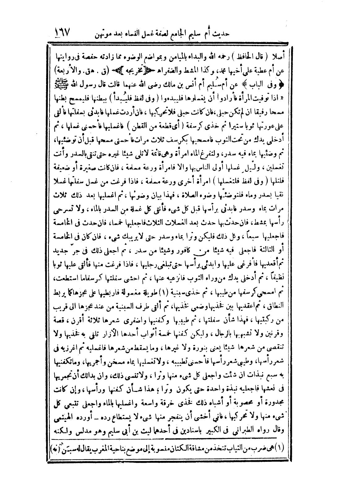 أصلا (قال الحافظ) رحمه الله والبداء بالميامن وبمواضع الوضوء مما زادته حفصه في روايتها عن أم عطية على أخيها محمد، وكذا المشط والضفر اهـ (تخريجه) (ق. هق. والأربعة) (وفي الباب) عن أم سليم أم أنس بن مالك رضي الله عنهما قال قال رسول الله صلى الله عليه وسلم "اذا توفيت المرأة فأرادوا أن يغسلوها فليبدوءوا (وفي لفظ فليبدأ) ببطنها فليمسح بطنها مسحا رفيقا ان لم تكن حبلى، فان كانت حبلى فلا تحركيها، فان أردت غسلها فابدئي بسفلها فألقى على عورتها ثوبا ستيرا ثم خذي كرسفة (أي قطعة من القطن) فاغسليها فأحسني غسلها، ثم أدخلي يدك من تحت الثوب فامسحيها بكرسف ثلاث مرات فأحسنى مسحها قبل أن توضئيها، ثم وضئيها بماء فيه سدر، ولتفرغ الماء امرأة وهى قائمة لا تلى شيئا غيره حتى تنقى بالسدر وأنت تغسلين، وليل غسلها أولى الناس بها والا فامرأة ورعة مسلمة، فان كانت صغيرة أو ضعيفة فلتلها (وفي لفظ فلتغسلها) امرأة أخرى ورعة مسلمة، فاذا فرغت من غسل سفلها غسلا نقيا بسدر وماء فلتوضئها وضوء الصلاة، فهذا بيان وضوئها، ثم اغسليها بعد ذلك ثلاث مرات بماء وسدر فابدئي برأسها قبل كل شيء فأنقى كل غسلة من السدر بالماء، ولا تسرحى رأسها بمشط، فان حدث بها حدث بعد الغسلات الثلاث فاجعليها خمسا، فان حدث في الخامسة فاجعليها سبعاً، وكل ذلك فليكن وترا بماء وسدر حتى لا يريبك شيء، فان كان في جر حديد ثم أقعديها فأفرغى عليها وابدئى برأسها حتى تبلغى رجليها، فاذا فرغت منها فألقى عليها ثوبا نظيفاً، ثم أدخلى يدك من وراء الثوب فانزعيه عنها، ثم احشي سفلتها كرسفاما استطعت، ثم امسحي كرسفها من طيبها، ثم خذي سبنية (1) طويلة مغسولة فاربطيها على عجزها إلى قريب من ركبتيها، فهذا شأن سفلتها، ثم طيبيها وكفنيها واضفرى شعرها ثلاثة أقرن، قصة وقرنين ولا تشبهبها بالرجال، وليكن كفنها خمسة أثواب أحدها الأزار تلفى به فخذيها ولا تنقصى من شعرها شيئا يعنى بنورة ولا غيرها، وما يسقط من شعرها فاغسليه ثم اغرزيه في شعر رأسها، وطيبي شعر رأسها فأحسنى تطييبه، ولا تغسليها بماء مسخن وأجمريها، وما تكفنيها به سبع نبذات ان شئت واجعلى كل شيء منها زترا، هذا شأن كفنها ورأسها، وإن كانت في نعشها فاجعليه نبذة واحدة حتى يكون وترا، هذا شأن كفنها ورأسها، وإن كانت مجدورة أو محصوبة أو أشباه ذلك فخذي خرقة واسعة واغسليها بالماء واجعلى تتبعي كل شيء منها ولا تحركيها، فانى أخشى أن ينفجر منها شيء لا يستطاع رده - أورده الهيثمي وقال رواه الطبرانى في الكبير باسنادين في أحدهما ليث بن أبى سليم وهو مدلس ولكنه