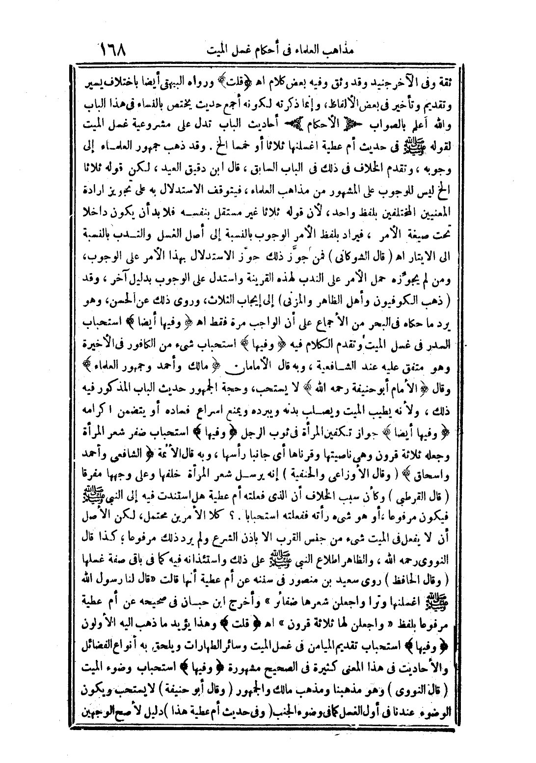 ثقة وفي الآخر جنيد وقد وثق وفيه بعض كلام اهـ (قلت) ورواه البهيقى أيضا باختلاف يسير وتقديم وتأخير فى بعض الألفاظ، وإنما ذكرته لكونه أجمع حديث يختص بالنساء فى هذا البابوالله آعلم بالصواب (الأحكام) أحاديث الباب تدل على مشروعية غسل الميت لقوله (ص) فى حديث أم عطية اغسلنها ثلاثا أو خمسا الخ. وقد ذهب جمهور العلماء إلى وجوبه، وتقدم الخلاف فى ذلك الباب السابق، قال ابن دقيق العيد، لكن قوله ثلاثا الخ ليس للوجوب على المشهور من مذاهب العلماء، فيتوقف الاستدلال به على تجويز ارادة المعنيين المختلفين بلفظ واحد، لأن قوله ثلاثا غير مستقل بنفسه فلا بد أن يكون داخلا تحت صيغة الأمر، فيراد بلفظ الأمر الوجوب بالنسبة إلى أصل الغسل والتدب بالنسبة الى الايتار اهـ (قال الشوكانى) فمن جوز ذلك جوز الاستدلال بهذا الأمر على الوجوب، ومن لم يجوزه حمل الأمر على الندب لهذه القرينه واستدل على الوجوب بدليل آخر، وقد (ذهب الكوفيون وأهل الظاهر والمزنى) إلى إيجاب الثلاث، وروى ذلك عن الحسن، وهو يرد ما حكاه فى البحر من الأجماع على أن الواجب مرة فقط اهـ (وفيها أيضا) استحباب السدر فى غسل الميت وتقدم الكلام فيه (وفيها) استحباب شئ من الكافور فى الأخيرة وهو متفق عليه عند الشافعية، وبه قال الأمامان (مالك وأحمد وجمهور العلماء) وقال (الأمام أبو حنيفة رحمه الله) لايستحب، وحجة الجمهور حديث الباب المذكور فيه ذلك، ولأنه يطيب الميت ويصلب بدنه ويبرده ويمنع اسراع فساده أو يتضمن اكرامه (وفيها أيضا) جواز تكفين المرأة فى ثوب الرجل (وفيها) استحباب ضفر شعر المرأة وجعله ثلاثة قرون وهى ناصيتها وقرناها أى جانبا رأسها، وبه قال الأئمة (الشافعى وأحمد واسحاق) (وقال الأوزاعى والحنيفة) إنه يرسل شعر المرأة خلفها وعلى وجهها مفرقا (قال القرطي) وكأن سبب الخلاف أن الذى فعلته أم عطية هل استندت فيه إلى النبي (ص) فيكون مرفوعا، أو هو شئ رأته ففعلته استحبابا.؟ كلا الأمرين محتمل، لكن الأصل أن يفعل فى الميت شئ من جنس القرب الا بإذن الشرع ولم يرد ذلك مرفوعا؛ كذا قال النووى رجمه الله، والظاهر النبى (ص) على ذلك واستئذانه فيه كما فى باقى صفة غسلها (وقال الحافظ) روى سعيد بن منصور فى سننه عن أم عطية أنها قالت "قال لنا رسول الله (ص) اغسلنها وترا واجعلن شعرها ضفائر" وأخرج ابن حبان فى صحيحه عن أم عطية مرفوعا بلفظ "واجعلن لها ثلاثة قرون" اهـ (قلت) وهذا يؤيد ما ذهب اليه الأولون (وفيها) استحباب تقديم الميامن فى غسل الميت وسائر الطهارات ويلحق به أنواع الفضائل والأحاديث فى هذا المعنى كثيرة فى الصحيح مشهورة (وفيها) استحباب وضوء الميت (قال النووى) وهو مذهبنا ومذهب مالك والجمهور (وقال أبو حنيفة) لا يستحب ويكون الوضوء عندنا فى أول الغسل كما فى وضوء الجنب (وفى حديث أم عطية هذا) دليل لأصح الوجهين