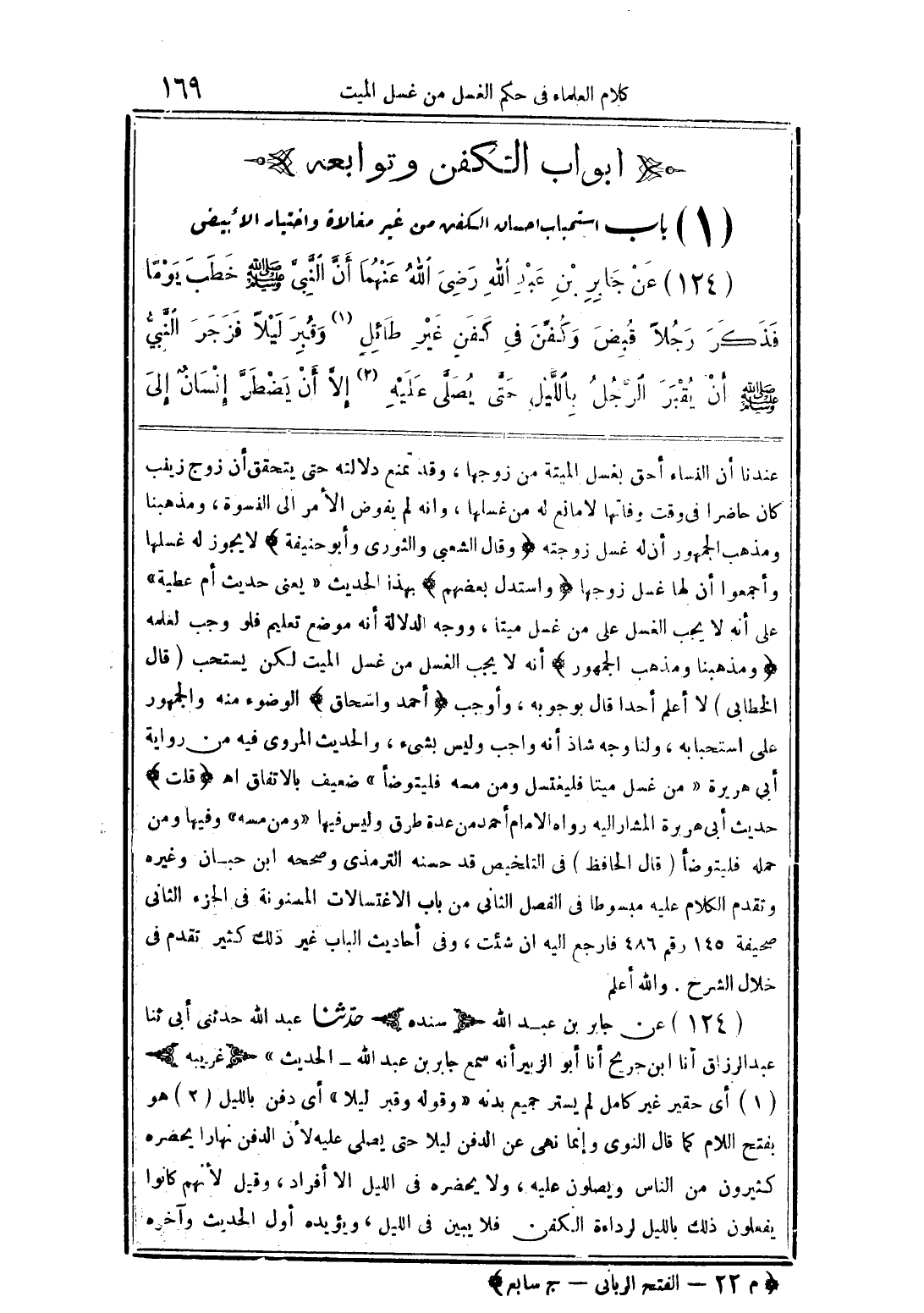 (124) عن جابر بن عبد الله رضي الله عنهما أنَّ النبيَّ صلى الله عليه وسلم خطب يومّاً فذكر رجلاً قبض وكفّن في كفن غير طائل وقبر ليلاً فزجر النَّبي صلى الله عليه وسلم أن يقبر الرجل باللَّيل حتى يصلَّى عليه إلا أن يضطرَّ إنسان إلى