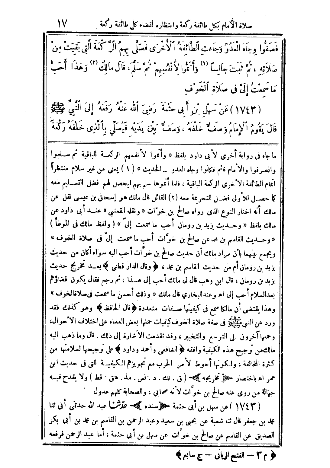 ما جاء فى رواية أخرى لأبى داود بلفظ "وأتموا لأنفسهم الركعة الباقية ثم سلموا وانصرفوا والأمام قائم فكانوا وجاه العدو الحديث" (1) يعنى من غير سلام منتظراً اتمام الطائفة الأخرى الركعة الباقية، فلما أتموها سلم بهم ليحصل لهم فضل التسليم معه كما حصل للأولى فضل التحريمة معه (2) القائل قال مالك هو إسحاق بن عيسى نقل عن مالك أنه اختار النوع الذى رواه صالح بن خوَّات "ونقله القعنبى" عند أبى داود عن مالك بلفظ "وحديث يزيد بن رومان أحب ما سمعت إلىّ" (ولفظ مالك فى الموطأ) "وحديث القاسم بن محمد عن صالح بن خوَّات أحب ما سمعت إلىَّ فى صلاة الخوف" ويجمع بينهما بأن مراد مالك أن حديث صالح بن خوَّات أحب اليه سواء أكان من حديث يزيد بن رومان أم من حديث القاسم بن محمد، (وقال الدار قطنى) بعد تخريج حديث يزيد بن رومان، قال ابن وهب قال لى مالك أحب إلى هذا، ثم رجع فقال يكون قضاؤهم بعد السلام أحب إلى اهـ وعند البخاري قال مالك "وذلك أحسن ما سمعت فى صلاة الخوف" وهذا يقتضى أن مالكا سمع فى كيفيتها صفات متعددة (قال الحافظ) وهو كذلك فقد ورد عن النبى صلى الله عليه وسلم فى صفة صلاة الخوف كيفيات حملها بعض العلماء على اختلاف الأحوال، وحملها آخرون على التوسع والتخيير، وقد تقدمت الأشارة إلى ذلك. قال وما ذهب اليه مالك من ترجيح هذه الكيفية وافقه (الشافعى وأحمد وداود) على ترجيحها لسلامتها من كثرة المخالفة، ولكونها أحوط لأمر الحرب مع تجويزهم الكيفية التى فى حديث ابن عمر اهـ باختصار (تخريجه) (ق. لك. د. نس. مذ. هق. قط) ولا يقدح فيه جهالة من روى عنه صالح بن خوَّات لأنه صحابى، والصحابة كلهم عدول