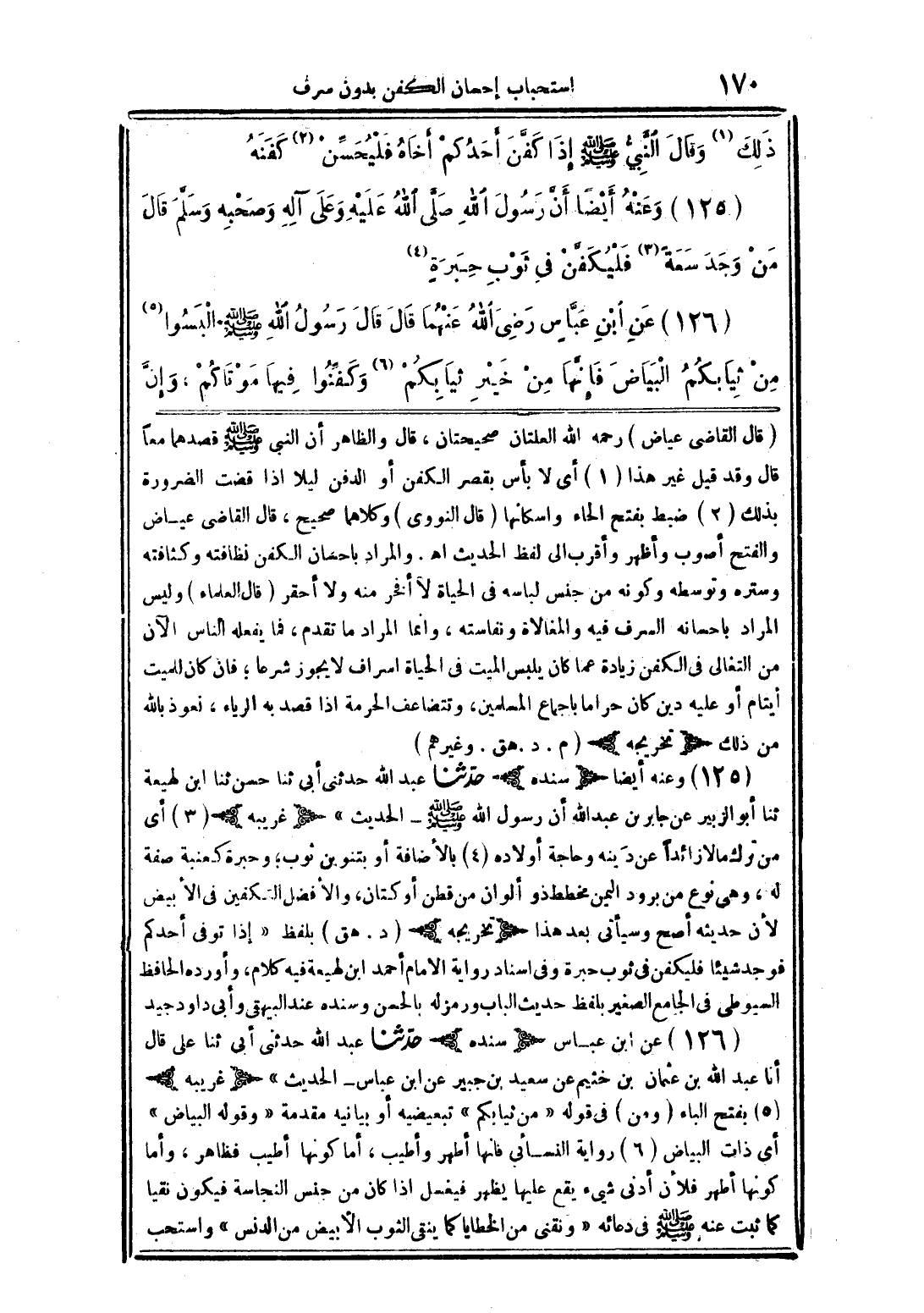 (125) وعنه أيضاً أن رسول الله صلى الله عليه وعلى آله وصحبه وسلَّم قال من وجد سعة فليكفَّن في ثوب حبرةٍ
