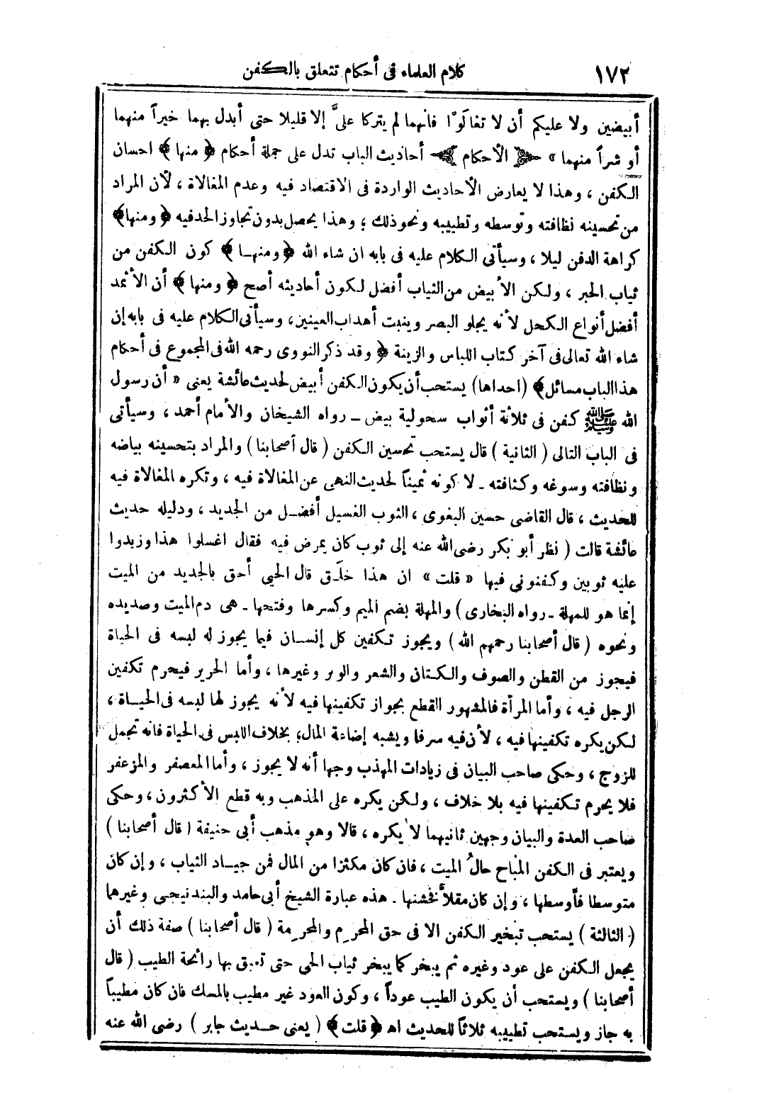 أبيضين ولا عليكم ألا تغالوا فانهما لم يتركا عليا الا قليلا حتى أبدل بهما خيرا منهما أو شرا منهما" (الأحكام) أحاديث الباب تدل على جملة أحكام (منها) احسان الكفن، وهذا لا يعارض الأحاديث الواردة فى الاقتصاد فيه وعدم المغالاة، لأن المراد من تحسينه نظافته وتوسطه وتطيبه ونحو ذلك؛ وهذا يحدث بدون تجاوز الحدفية (ومنها) كراهة الدفن ليلا، وسيأتى اكلام عليه فى بابه ان شاء الله (ومنها) كون الكفن ثياب الحبر، ولكن الأبيض من الثياب أفضل لكون أحاديثه أصح (ومنها) أن الانمد أفضل أنواع الكحل لأنه يجلو البصر وينبت أهداب العينين، وسيأتى الكلام عليه فى بابه ان شاء الله تعالى فى كتاب اللباس والزينة (وقد ذكر النووى رحمه الله فى المجموع فى أحكام هذا الباب مسائل) (احداها) يستحب أن يكون الكفن أبيض لحديث عائشة يعنى (ان رسول الله صلى الله عليه وسلم كفن فى ثلاثة أثواب سحولية بيض رواه الشيخان والأمام أحمد، وسيأتى فى الباب التالى (الثانية) قال يستحب تحسين الكفن (قال أصحابنا) والمراد بتحسينه بياضه ونظافته وسوغه وكثافته لا كونه ثمينا لحديث النهى عن المغالاه فيه، وتكره المغالاه فيهللحديث، قال القاضى حسين البغوى، الثوب الغسيل أفضل من الجديد، ودليله حديث عائشة قالت (نظر أبو بكر رضى الله عنه الى ثوب كان يمرض فيه فقال اغسلوا هذا وزيدوا عليه ثوبين وكفنونى فيها"قلت" ان هذا خلق قال الحى أحق بالجديد من الميت انما هو للمهلة رواه البخارى) والمهلة بضم الميم وكسرها وفتحها هى دم الميت وصديده ونحوه (قال اصحابنا رحمهم الله) ويجوز تكفين كل انسان فيما يجوز له لبسه فى الحياه فيجوز من القطن والصوف والكتان والشعر والوبر وغيرها، أما الحرير فيحرم تكفين الرجل فيه، وأما المرأة فالمشهور القطع بجواز تكفينها فيه لأنه يجوز لها لبسه فى الحياه لكن يكره تكفينها فيها، لأن فيه سرفا ويشبه إضاعة المال؛ بخلاف اللبس فى الحياة فانه تجمل للزوج، وحكى صاحب البيان فى زيادات المهذب وجها أنه لا يجوز، وأما المعصفر والمزعفر فلا يحرم تكفينها فيه بلا خلاف، ولكن يكه على المذهب وبه قطع الأكثرون، وحكى صاحب العده والبيان وجهين ثانيهما لا يكره، قالا وهو مذهب أبى حنيفه (قال أصحابنا) ويعتبر فى الكفن المباح حال الميت، فانه كان مكنزا من المال فمن جياد الثياب، وإن كان متوسطا فأوسطها، وإن كان مقلا فاخشنها. هذه عبارة الشيخ أبى حامد والبندنيجى وغيرهما (الثالثه) يستحب تبخير الكفن الا فى حق المحرم والمحرمه (قال أصحابنا) صفة ذلك أن يجعل الكفن على عود وغيره ثم يبخر كما يبخر ثياب الحى حتى تعبق بها رائحة الطيب (قال أصحابنا) ويستحب أن يكون الطيب عودا، وكون العود غير مطيب بالمسك فان كان مطيبا به جاز ويستحب تطيبه ثلاثا للحديث اه (قلت) (يعنى حديث جابر) رضي الله عنه