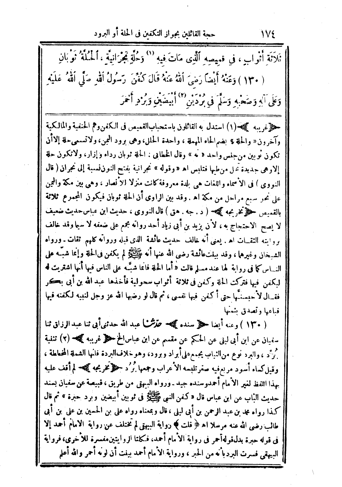 (130) وعنه أيضاً رضي الله عنه قال كفن رسول الله صلَّى الله عليه وعلى آله وصحبه وسلّم في بردين أبيضين وبردٍ أحمر