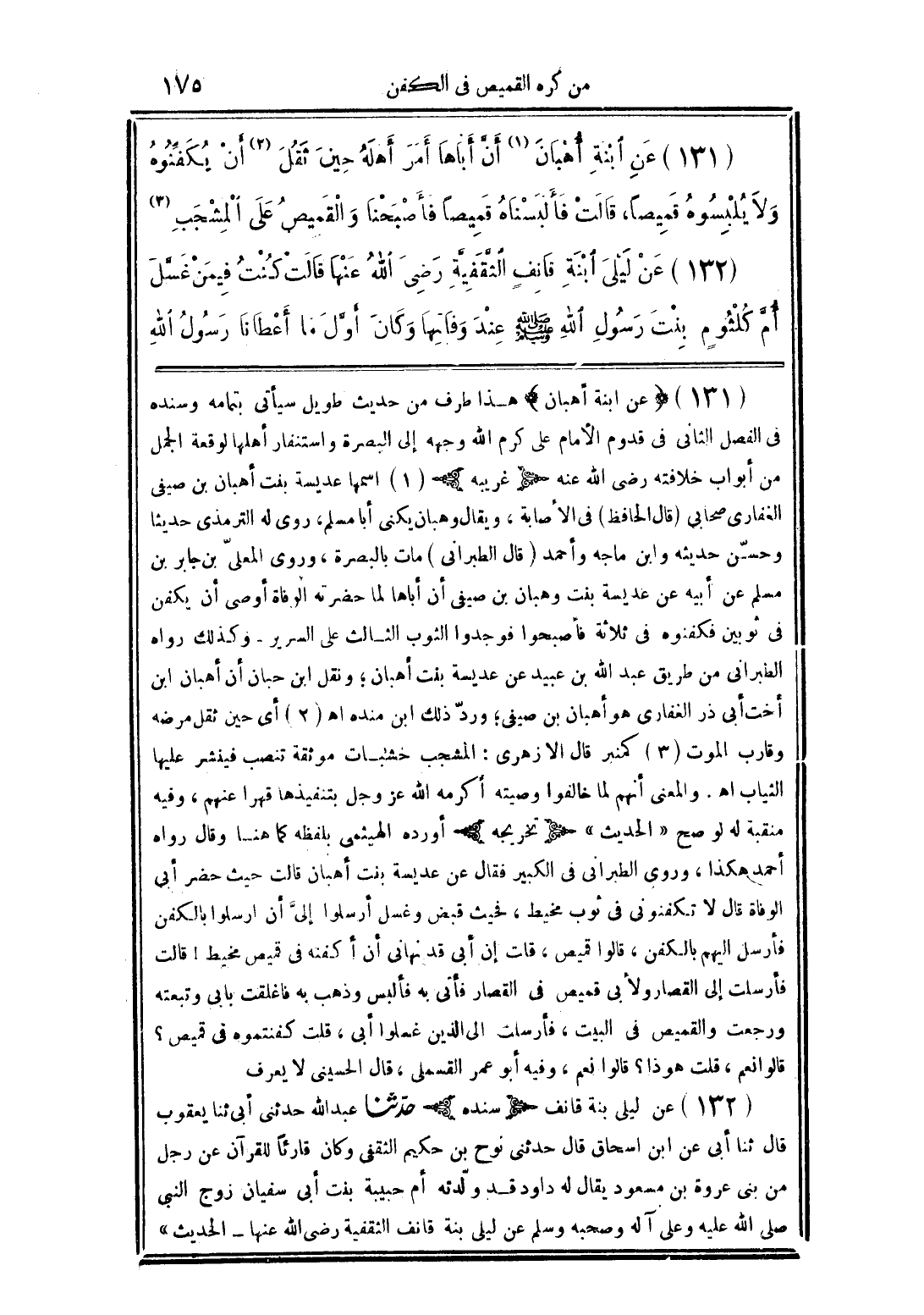 (131) عن ابنة أهبان أن أباها أمر أهله حين ثقل أن يكفّنوه ولا يلبسوه قميصاً، قالت فألبسناه قميصاً فأصبحنا والقميص على المشجب