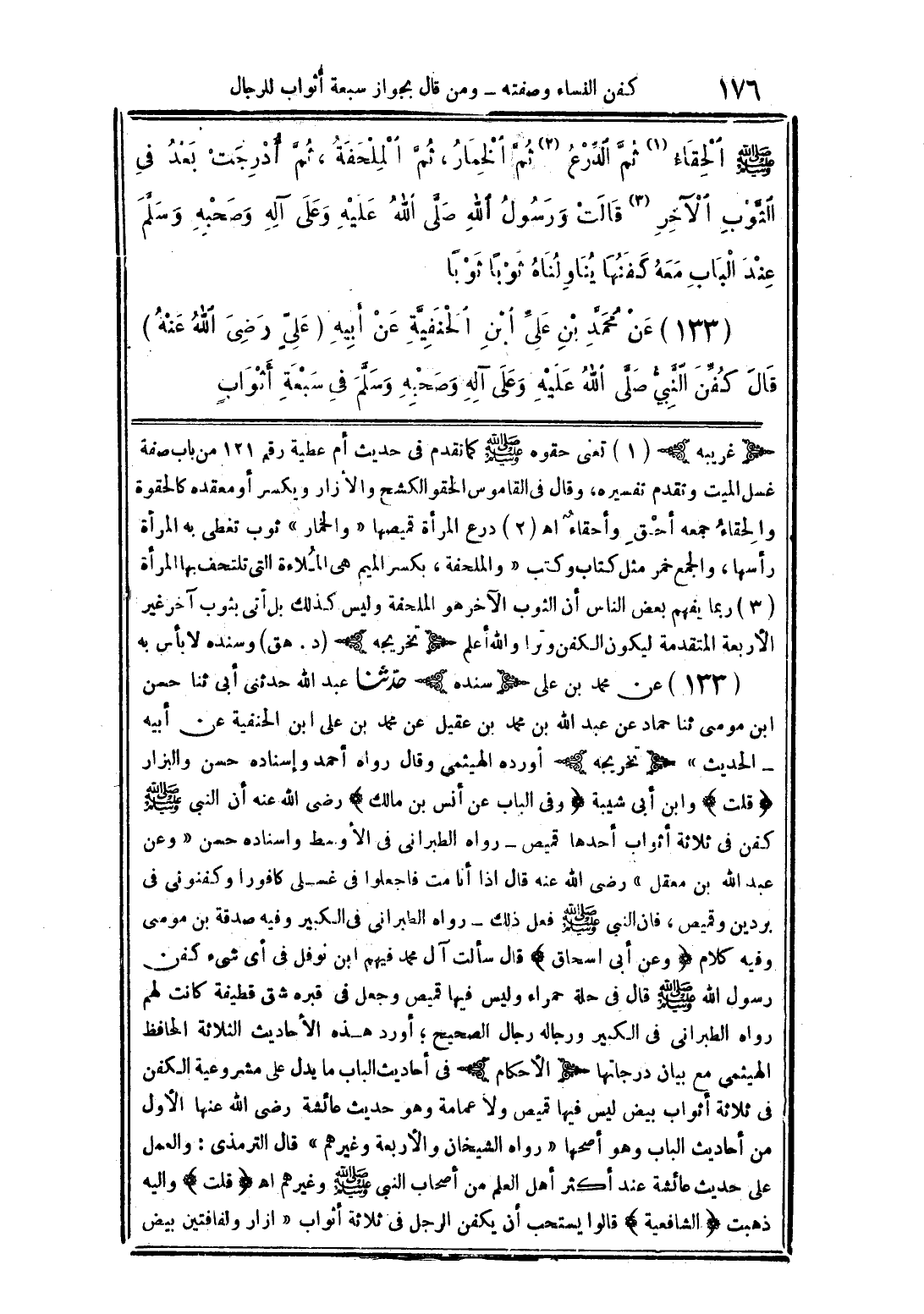 (133) عن محمد بن على ابن الحنفيَّة عن أبيه (على رضي الله عنه) قال كفّن النَّبي صلى الله عليه وعلى آله وصحبه وسلَّم في سبعة أثوابٍ