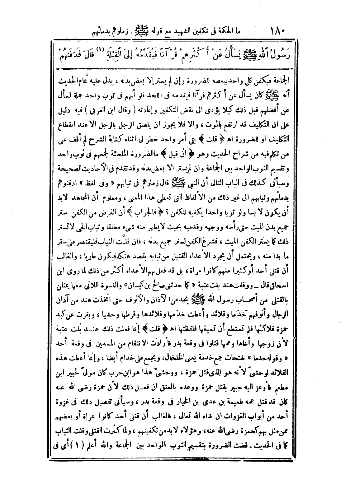 الجماعة فيكفن كل واحد ببعضه للضرورة وإن لم يستر إلا بعض بدنه، يدل عليه تمام الحديث انه صلى الله عليه وسلم كان يسأل عن أكثرهم قرآنا فيقدمه فى اللحد فلو أنهم فى ثوب واحد جمله لسأل عن أفضلهم قبل ذلك كيلا يؤدى الى نقض التكفين وإعادته (وقال ابن العربى) فيه دليل على ان التكليف قد ارتفع بالموت، والا فلا يجوز ان يلصق الرجل بالرجل الا عند انقطاع التكليف او للضرورة اه (قلت) بقى أمر واحد خطر لى اثناء كتابة الشرح لم اقف على من تكلم فيه من شراح الحديث وهو (ان قيل) ما الضرورة الملجئة لجمعهم فى ثوب واحد وتقسيم الثوب الواحد بين الجماعه وان لم يستر الا بعض بدنه وقد تقدم فى الأحاديث الصحيحة وسيأتى كذلك فى الباب التالى أن النبى صلى الله عليه وسلم قال زملوهم فى ثيابهم (وفى لفظ) ادفنوهم بدمائهم وثيابهم الى غير ذلك من اللفاظ التى تعطى هذا المعنى، ومعلوم ان المجاهد لابد أن يكون لابسا ولو ثوبا واحدا يكفيه للكفن؟ (فالجواب) أن الغرض من الكفن ستر جميع بدن الميت حتى رأسه ووجهه وقدميه بحيث لا يظهر منه شيئا مطلقا وثياب الحى لا تستر ذلك كما يستر الكفن الميت، فشرع الكفن لستر جميع بدنه، فان قلت الثياب فليقتصر على ستر ما بدا منه، ويحتمل أن يجرد الأعداء القتيل من ثيابه بقصد هتكه فيكون عاريا، والغالب ان قتل أحد أو كثيرا منهم كانوا عراة، بل قد فعل بهم الأعداء أكثر من ذلك لما روى ابن اسحاق قال - ووقفت هند بنت عتبه (كما حدثنى صالح بن كيسان) والنسوة اللاتى معها يمثلن بالقتلى من أصحاب رسول الله صلى الله عليه وسلم يجدعن الآذان والأنوف حتى اتخذت هند من آذان الرجال وأنوفهم خدما وقلائد وأعطت خدمها وقلائدها وقرطها وحشيا، وبقرت عن كبد حمزة فلاكنها فلم تستطع ان تصيغها فلفظتها اه (قلت) إنما فعلت ذلك هند بنت عتبة لأن زوجها وأخاها وعمها قتلوا فى وقعة بدر فأرادت الأنتقام من المسلمين فى وقعة أحد "وقوله خدما" بفتحات جمع خدمة يعنى الخلخال، ويجمع على خدام ايضا، وإنما أعطت هذه القلائد لوحشى لأنه هو الذى قتل حمزة، ووحشى هذا هو ابن حرب كان مولى لجبير ابن مطعم فأوعز اليه جبير بقتل حمزه ووعده بالعتق ان فعل ذلك لان حمزة رضى الله عنه كان قد قتل عمه طعيمه بن عدى بن الخيار فى وقعة بدر، وسيأتى تفصيل ذلك فى غزوة أحد من أبواب الغزوات ان شاء الله تعالى، فالغالب أن قتلى أحد كانوا عراة أو بعضهم ممن مثل بهم كحمزة رضى الله عنه، وهؤلاء لابد من تكفينهم، ولما كثرت القتلى وقلت الثياب كما فى الحديث - قضت الضرورة بتقسيم الثوب الواحد بين الجماعه والله أعلم (1) أي في