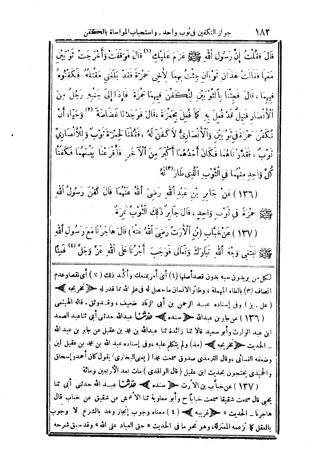 (136) عن جابر بن عبد الله رضي الله عنهما قال كفن رسول الله صلى الله عليه وسلم حمزة في ثوب واحدٍ، قال جابر ذلك الثَّوب نمرة
