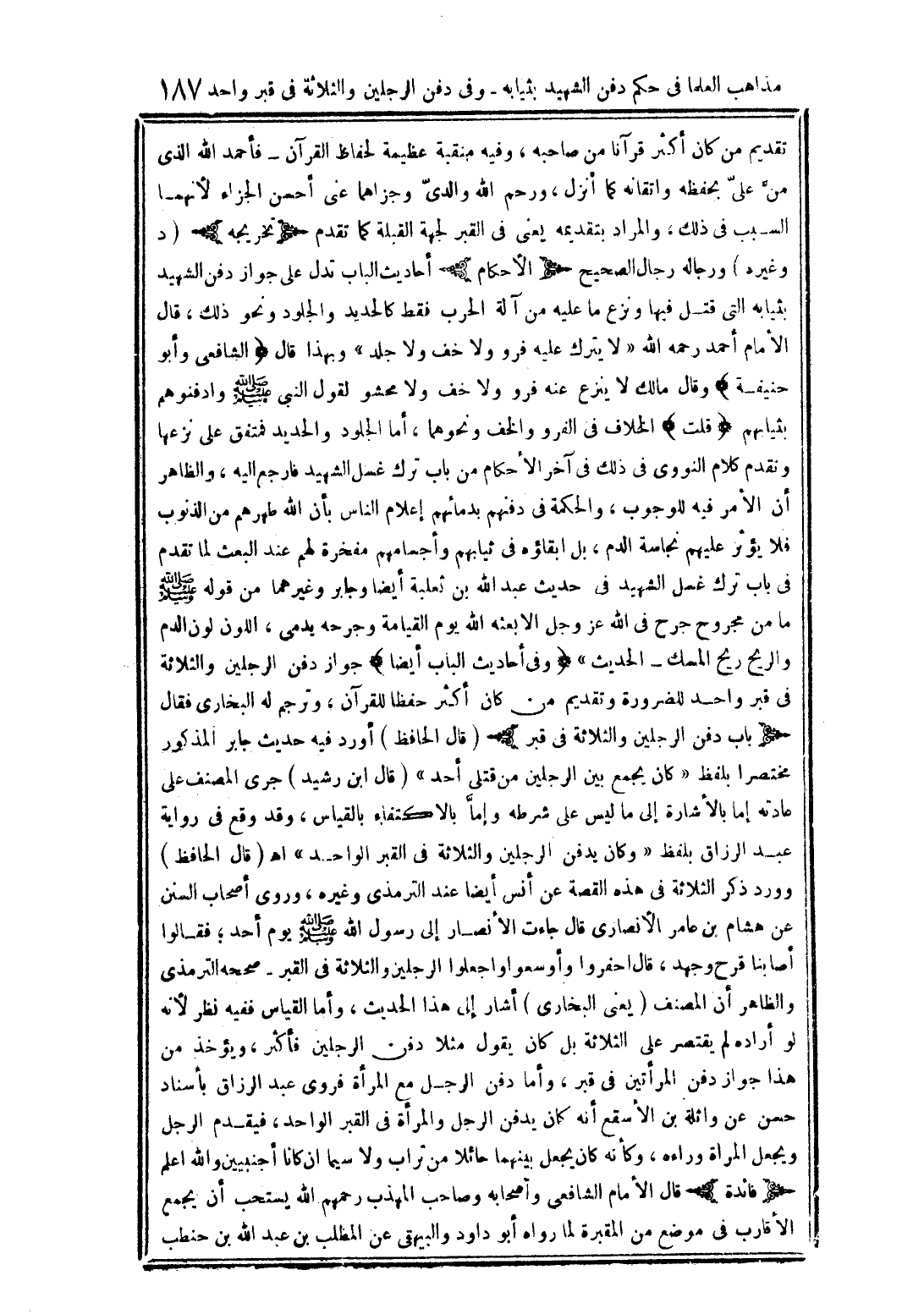 تقديم من كان أكثر قرآنا من صاحبه، وفيه منقبة عظيمة لحفاظ القرآن - فأحمد الله الذي من على بحفظه وإتقانه كما انزل، ورحم الله والدي وجزاهما على أحسن الجزاء لأنهما السبب في ذلك، والمراد بتقديمه يعمي في القبر لجهة القبلة كما تقدم (تخريجه) (د وغيره) ورجاله رجال الصحيح (الأحكام) أحاديث الباب تدل على جواز دفن الشهيد بثيابه التي قتل فيها ونزع ما عليه من آلة الحرب فقط كالحديد والجلود ونحو ذلك، قال الإمام أحمد رحمه الله "لا يترك عليه فرو ولا خف ولا جلد" وبهذا قال (الشافعي وأبو حنيفة) وقال مالك لا ينزع عنه فرو ولا خف ولا محشو لقول النبي صلى الله عليه وسلم وادفنوهم بثيابهم (قلت) الخلاف في الفرو والخف ونحوهما، أما الجلود والحديد فنفق على نزعها ونقدم كلام النووي في ذلك في آخر الأحكام من باب ترك غسل الشهيد فارجم إليه، والظاهر أن الأمر فيه للوجوب، والحكمة في دفنهم بدمائهم إعلام النسا بأن الله طهرهم من الذنوب فلا يؤثر عليهم نجاسة الدم، بل إبقاؤه في ثيابهم وأجسامهم مفخرة لهم عند البعث لما تقدم في باب ترك غسل الشهيد في حديث عبد الله بن ثعلبة أيضا وجابر وغيرهما من قوله صلى الله عليه وسلم ما من مجروح جرح في الله عز وجل إلا بعثه يوم القيامة وجرحه بدمي، اللون لون الدم والريح ريح المسك - الحديث" (وفي أحاديث الباب أيضا) جواز دفن الرجلين والثلاثة في قبر واحد للضرورة وتقدمي من كان أكثر حفظا للقرآن، وترجم له البخاري فقال (باب دفن الرجلين والثلاثة في قبر) (قال الحافظ) أورد فيه حديث جابر المذكور مختصرا بلفظ "كان يجمع بين الرجلين من قتلي أحد" (قال ابن رشيد) جرى المصنف على مادته إما بالإشارة إلي ما ليس على شرطه وإما بالاكتفاء بالقياس، وقد وقع في رواية عبد الرزاق بلفظ "وكان يدفن الرجلين والثلاثة في القبر الواحد" اهـ (قال الحافظ) ورود ذكر الثلاثة في هذه القصة عن أنس أيضا عند الترمذي وغيره، وروي أصحاب السنن عن هشام بن عامر الأنصاري قال جاءت الأنصار إلي رسول الله صلى الله عليه وسلم يوم أحد، فقالوا أصابنا قرح وحمد، قال احفروا وأوسعوا واجعلوا الرجلين والثلاثة في القبر صححه الترمذي والظاهر أن المصنف (يعني البخاري) أشار إلي هذا الحديث، وأما القياس ففيه نظر لأنه لو أراده لم يقتصر على الثلاثة بل كان يقول مثلا دفن الرجلين فأكثر، ويؤخذ من هذا جواز دفن المرأتين في قبر، وإسناد حسن عن واثلة بن الأسقع أنه كان يدفن الرجل والمرأة في القبر الواحد، فيقدم الرجل ويجعل المرأة وراءه، وكأنه كان يجعل بينهما حائلا من تراب ولاسيما أن كانا أجنبيين والله اعلم (فائدة) قال الإمام الشافعي وأصحابه وصاحب المهذب رحمهم الله يتسحب أن يجمع الأقارب في موضع من المقبرة لما رواه أبو داود والبيهقي عن المطلب بن عبد الله بن حنطب
