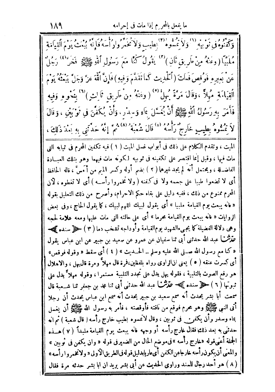 الميت، وتقدم الكلام على ذلك في أبواب غسل الميت (1) فيه تكفين المحرم في ثيابه التي مات فيها، وقيل إنما اقتصر على تكفينه في ثوبيه لكونه مات فيهما وهو بتلك العبادة الفاضلة، ويحتمل أنه لم يجد غيرها (2) بضم أوله وكسر الميم من أمس، قاله الحافظ أي لا تضعوا طيبا على جسمه ولا في كفنه (ولا تخمروا رأسه) أي لا تغطوه، لأن المحرم ممنوع من ذلك، ففيه دليل على بقاء حكم الإحرام، وأصرح من ذلك التعليل بقوله "فأنه يبعث يوم القيامة ملبيا" أي يقول لبيك اللهم لبيك، كما يقول الحاج، وفي بعض الروايات "فأنه يبعث يوم القيامة محرما" أي على حالته التي مات عليها ومعه علامة لحجه وهي دلالة الفضيلة كما يجيء الشهيد يوم القيامة وأوداجه تشحب دماً (3) (سنده) حدثنا عبد الله حدثني أبي ثنا سفيان عن عمرو عن سعيد بن جبير عن لاين عباس يقول "كنا مع رسول الله صلى الله عليه وسلم - الحديث" (4) أي سقط "وقوله فوقص" أي كسرت عنقه (5) يعني أن الراوي رواه بلفظين، فمرة قال مهلاً ومرة قال يهل، والإهلال هو رفع الصوت بالتلبية، فقوله يهل يدل على تجدد التلبية مستمراً، وقوله مهلاً يدل على ثبوتها (6) (سنده) حدثنا عبد الله حدثني أبي ثنا محمد بن جعفر ثنا شعبة قال سمعت أبا بشر يحدث أنه سمع سعيد بن جبير يحدث أنه سمع بن عباس يحدث أن رجلاً أتي النبي صلى الله عليه وسلم وهو محرم فوقع من ناقته فأوقصته، فأمر به رسول الله صلى الله عليه وسلم أن يغسل بماء وسدر وأن يكفن في ثوبين، وقال لا تمسوه بطيب خارج رأسه (قال شعبة) ثم أنه حدثني به بعد ذلك فقال خارج رأسه أو وجهه فأنه يبعث يوم القيامة ملبداً (7) هذه الجملة أعني قوله "خارج رأسه" في موضع الحال من الضمير في قوله "وإن يكفن في ثوبين" والمعني أن يكون في رأسه خارجاً عن الكفن أي عاريا بدليل قوله في الطريق الأولي "ولا تخمروا رأسه" (8) هو أحد للسند وراوي الحديث عن أبي بشر يريد أن أبا بشر حدثه مرة فقال