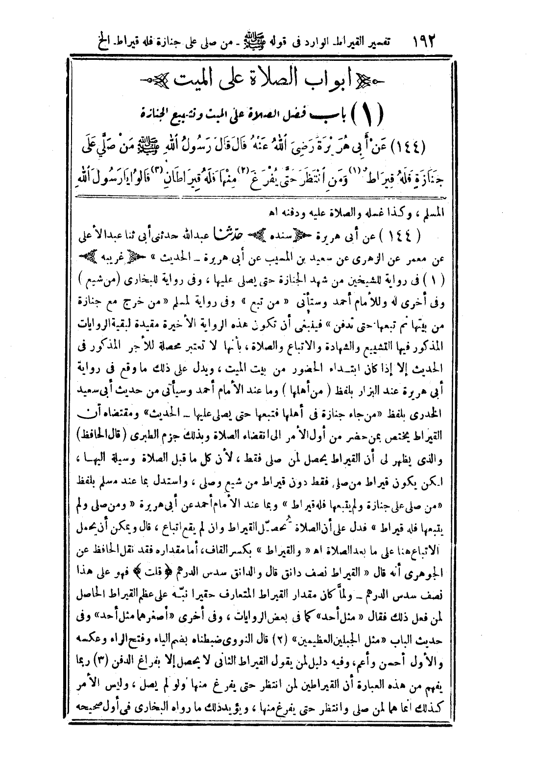 (144) عن أبي هريرة رضي الله عنه قال قال رسول الله صلى الله عليه وسلم من صلَّى على جنازة فله قيراط ومن انتظر حتَّى يفرغ منها فله قيراطان قالوا يا رسول الله