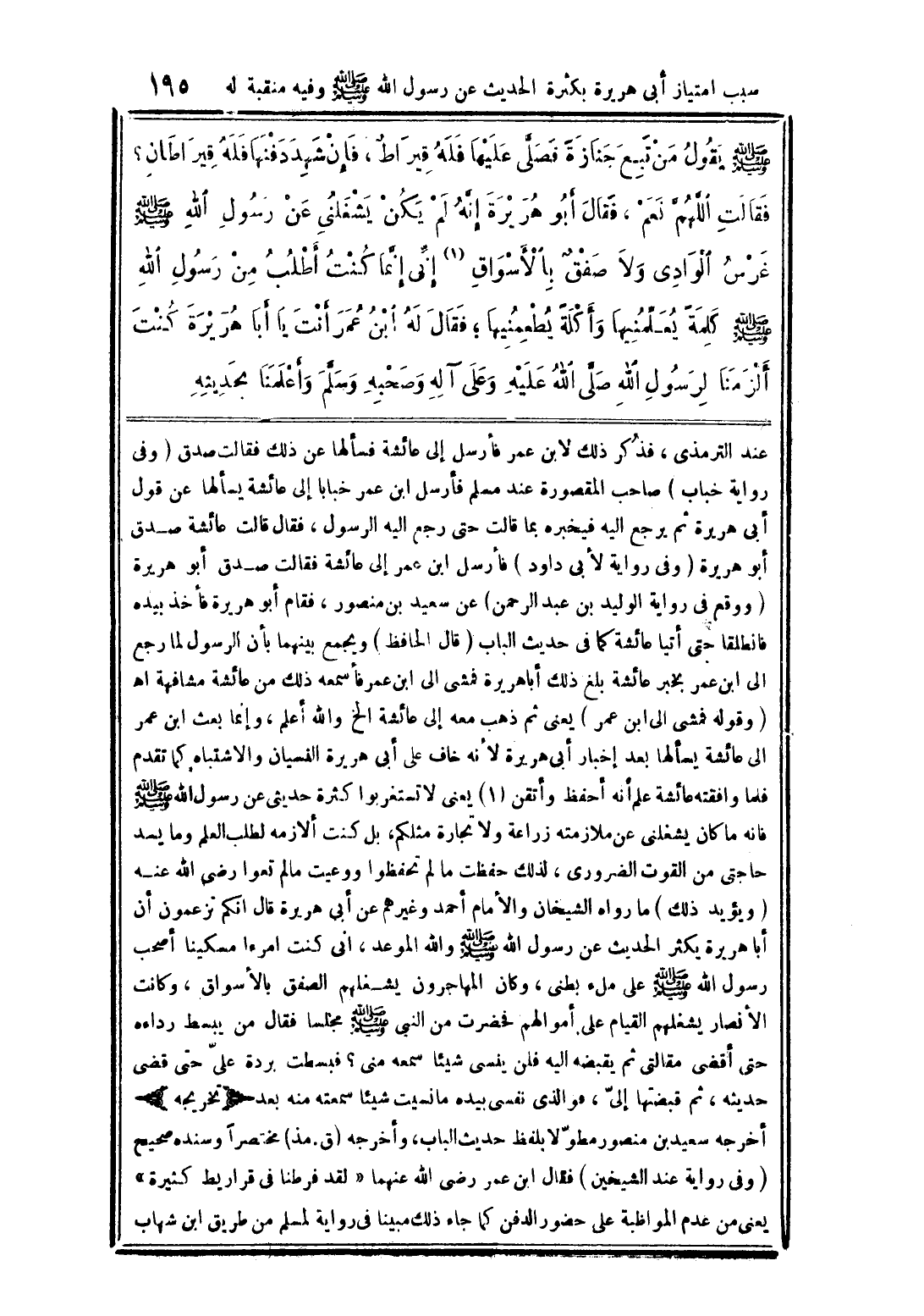 عند الترمذي، فذكر ذلك البن عمر فأرسل إلى عائشة فسألها عن ذلك فقالت صدق (وفى رواية خباب) صاحب المقصورة عند مسلم فأرسل ابن عمر خبابا إلى عائشة يسألها عن قول أبى هريرة ثم يرجع اليه فيخبره بما قالت حتى رجع اليه الرسول، فقال قالت عائشة صدق أبو هريرة (وفى رواية لأبى داود) فأرسل ابن عمر إلى عائشة فقالت صدق أبو هريرة (ووقع فى رواية الوليد بن عبدالرحمن) عن سعيد بن منصور، فقام أبو هريرة فأخذ بيده فانطلقا حتى أتيا عائشة كما فى حديث الباب (قال الحافظ) ويجمع بينهما بأن الرسول لما رجع الى ابن عمر بخير عائشة بلغ ذلك أبا هريرة فمشى الى ابن عمر فأسمعه ذلك من عائشة مشافهة اهـ (وقوله فمشى الى ابن عمر) يعنى ثم ذهب معه إلى عائشة الخ والله أعلم، وإنما بعث ابن عمر الى عائشة يسألها بعد إخبار أبى هريرة لأنه خاف على أبى هريرة النسيان والا شتباه كما تقدم فلما وافقته عائشة علم أنه أحفظ وأتقن (1) يعنى لا تستغربوا كثرة حديثى عن رسول الله (ص) فانه ما كان يشغلنى عن ملازمته زراعة ولا تجارة مثلكم، بل كنت ألازمه لطلب العلم وما يسد حاجتى من القوت الضرورى، لذلك حفظت مالم تحفظوا ووعيت مالم تعوا رضى الله عنه (ويؤيد ذلك) مارواه الشيخان والأمام أحمد وغيرهم عن أبى هريرة قال انكم تزعمون أن أبا هريرة يكثر الحديث عن رسول الله (ص) والله الموعد، انى كنت امرءا مسكينا أصحب رسول الله (ص) على ملء بطنى، وكان المهاجرون يشغلهم الصفق بالأسواق، وكانت الأنصار يشغلهم القيام على أموالهم فحضرت من النبي (ص) مجلسا فقال من يبسط رداءه حتى أقضى مقالتى ثم يقبضه اليه فلن ينسى شيئا سمعه منى؟ فبسطت بردة على حتى قضى حديثه، ثم قبضها إلى، فوالذى نفسى بيده مانسيت شيئا سمعته منه بعد (تخريجه) أخرجه سعيدبن منصور مطو لا بلفظ حديث الباب، وأخرجه (ق. مذ) مختصراً وسنده صحيح (وفى روايه عند الشيخين) فقال ابن عمر رضى الله عنهما "لقد فرطنا فى قراريط كثيرة" يعنى من عدم المواظبة على حضور الدفن كما جاء ذلك مبينا فى رواية لمسلم من طريق ابن شهاب