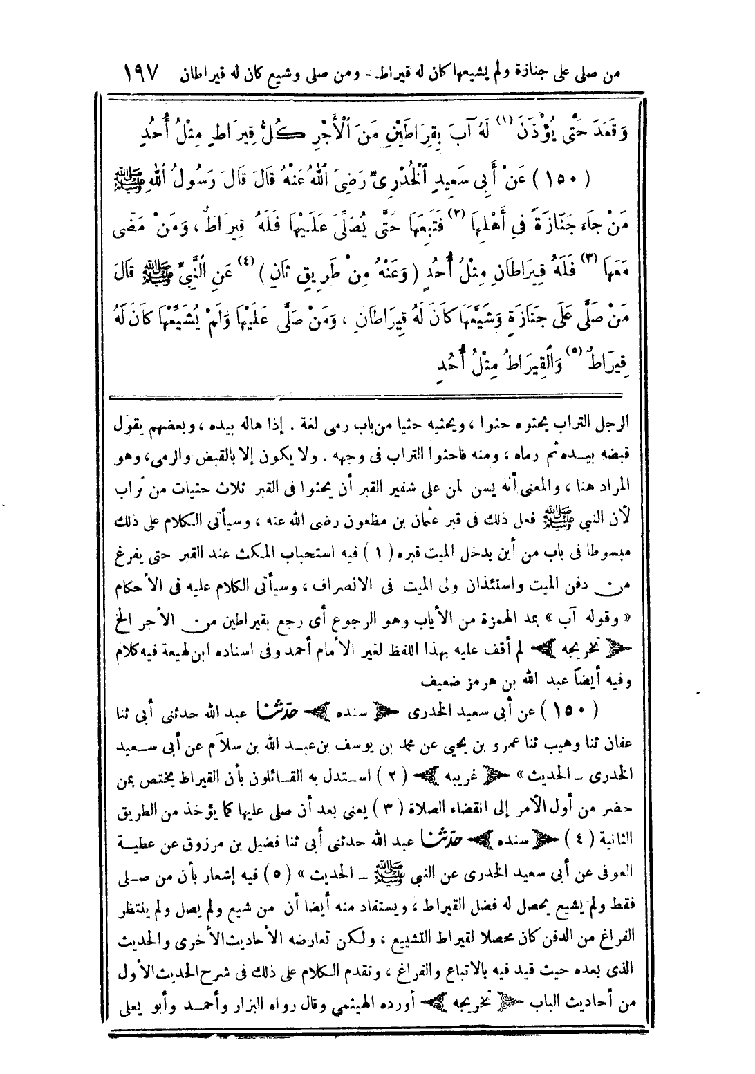 (150) عن أبي سعيدٍ الخدرىّ رضي الله عنه قال قال رسول الله صلى الله عليه وسلم من جاء جنازة في أهلها فتبعها حتَّى يصلى عليها فله قيراط، ومن مضى معها فله قيراطان مثل أحدٍ (وعنه من طريق ثانٍ) عن النَّبيّ صلَّى الله عليه وسلَّم قال من صلَّى على جنازة وشيَّعها كان له قيراطان، ومن صلى عليها ولم يشيّعها كان له قيراط والقيراط مثل أحدٍ