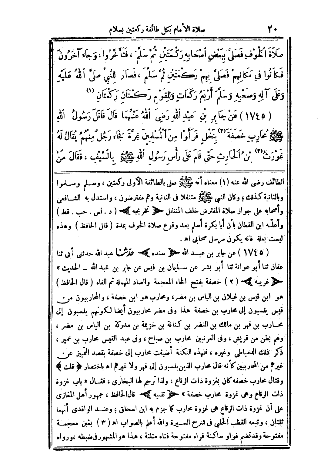 (1745) عن جابر بن عبد الله (سنده) حدّثنا عبد الله حدثنى أبى ثنا عفان ثنا أبو عوانة ثنا أبو بشر عن سليمان بن قيس عن جابر بن عبد الله الحديث" (غريبه) (2) خصفة بفتح الخاء المعجمة والصاد المهملة ثم الفاء (قال الحافظ) هو ابن قيس بن غيلان بن الياس بن مضر، ومحارب هو ابن خصفة، والمحاربيون من قيس ينسبون إلى محارب بن خصفة هذا وفى مضر محاربيون أيضا لكونهم ينسبون إلى محارب بن فهر بن مالك النضر بن كنانة بن خزيمة بن مدركة بن الياس بن مضر، وهم بطن من قريش، وفى العرنيين محارب بن صباح، وفى عبد القيس محارب بن عمير، ذكر ذلك الدمياطى وغيره، فلهذه النكتة أضيفت محارب إلى خصفة بقصد التمييز عن غيرهم من المحاربيين كأنه قال محارب الذين ينسبون إلى فهر ولا غيرهم اهـ باختصار (قلت) وقتال محارب خصف كان بغزوة ذات الرقاع، ولذا ترجم لها البخارى، فقال "باب غزوة ذات الرقاع وهى غزوة محارب خصفة" (تنبيه) قال الحافظ، جمهور أهل المغازى على أن غزوة ذات الرقاع هى غزوة محارب كما جزم به ابن اسحاق؛ وعند الواقدى أنهما ثنتان، وتبعه القطب الحلبى فى شرح السيرة والله أعلم بالصواب اهـ (3) بغين معجمة مفتوحة وقد تضم فواو ساكنة فراء مفتوحة فثاء مثلثة، هذا هو المشهور في ضبطه، ورواه