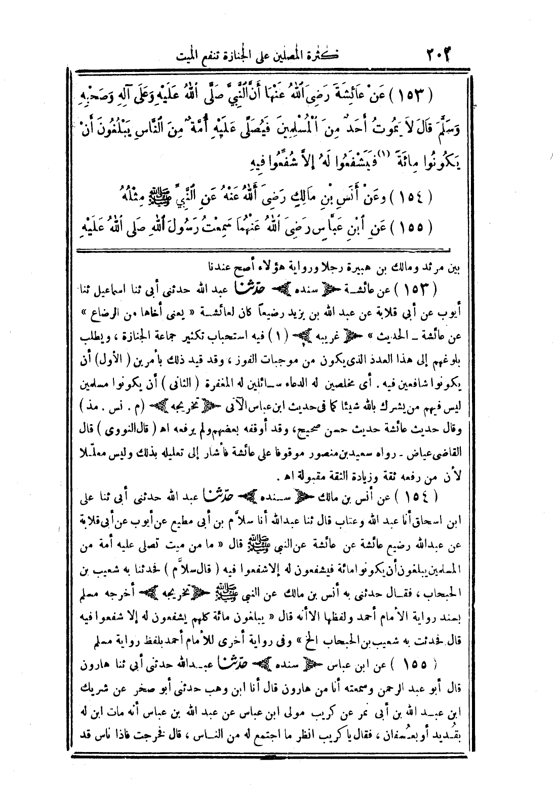 (153) عن عائشة رضي الله عنها أنَّ النَّبيَّ صلَّى الله عليه وعلى آله وصحبه وسلَّم قال لا يموت أحد من المسلمين فيصلّى عليه أمَّه من النَّاس يبلغون أن يكونوا مائة فيشفعوا له إلا شفّعوا فيه