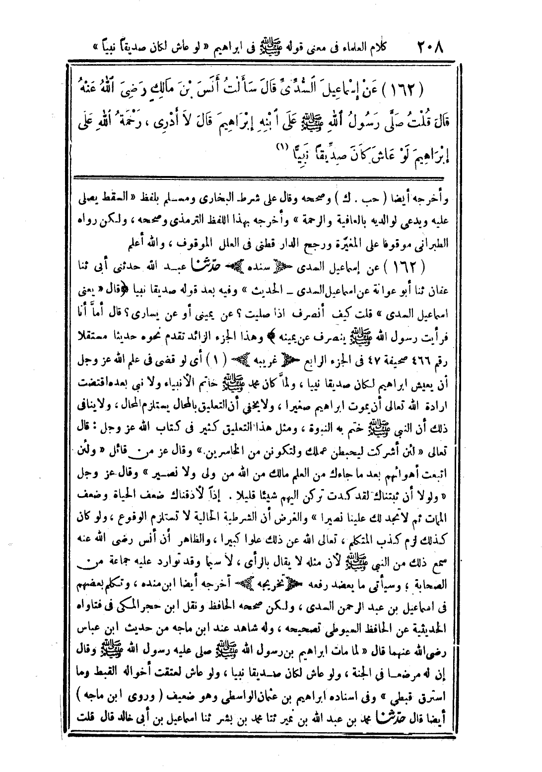 (162) عن إسماعيل السُّدّي قال سألت أنس بن مالك رضي الله عنه قال قلت صلَّى رسول الله صلى الله عليه وسلم على ابنه إبراهيم قال لا أدرى، رحمة الله على إبراهيم لو عاش كان صدّيقاً نبياً