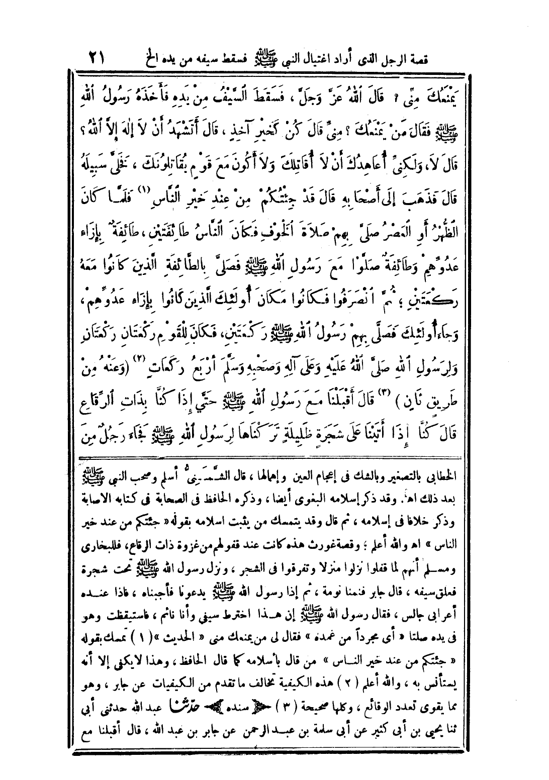 يمنعك منِّي، قال الله عزَّ وجلَّ، فسقط السيف من يده فأخذه رسول الله صلى الله عليه وسلم فقال من يمنعك؟ منىَّ قال كن كخير آخذ، قال أتشهد أن لا إله إلا الله؟ قال لا، ولكنيِّ أعاهدك أم لا أقاتلك ولا أكون مع قوم يقاتلونك، فخلىَّ سبيله قال فذهب إلى أصحابه به قال قد جئتكم من عند خير النَّاس فلمَّا كان الظُّهر أو العصر صلىَّ بهم صلاة الخوف فكان الن! َاس طائفتين، طائفة بإزاء عدوِّهم وطائفة صلَّوا مع رسول الله صلى الله عليه وسلم فصلىَّ بالطَّائفة الَّذين كانوا معه ركعتين؛ ثمَّ انصرفوا فكانوا مكان أولئك الذين كانوا بإزاء عدوِّهم، وجاء أولئك فصلىَّ بهم رسول الله صلى الله عليه وسلم ركعتين، فكان للقوم ركعتان ركعتان ولرسول الله صلى الهل عليه وعلى آله وصحبه وسلَّم أربع ركعات (وعنه من طريق ثان) قال أقبلنا مع رسول الله صلى الله عليه وسلم حتَّى إذا كنَّا بذات الرِّقاع قال كنَّا إذا أتينا على شجرة ظليلة تركناها لرسول الله صلى الله عليه وسلم فجاء رجل من