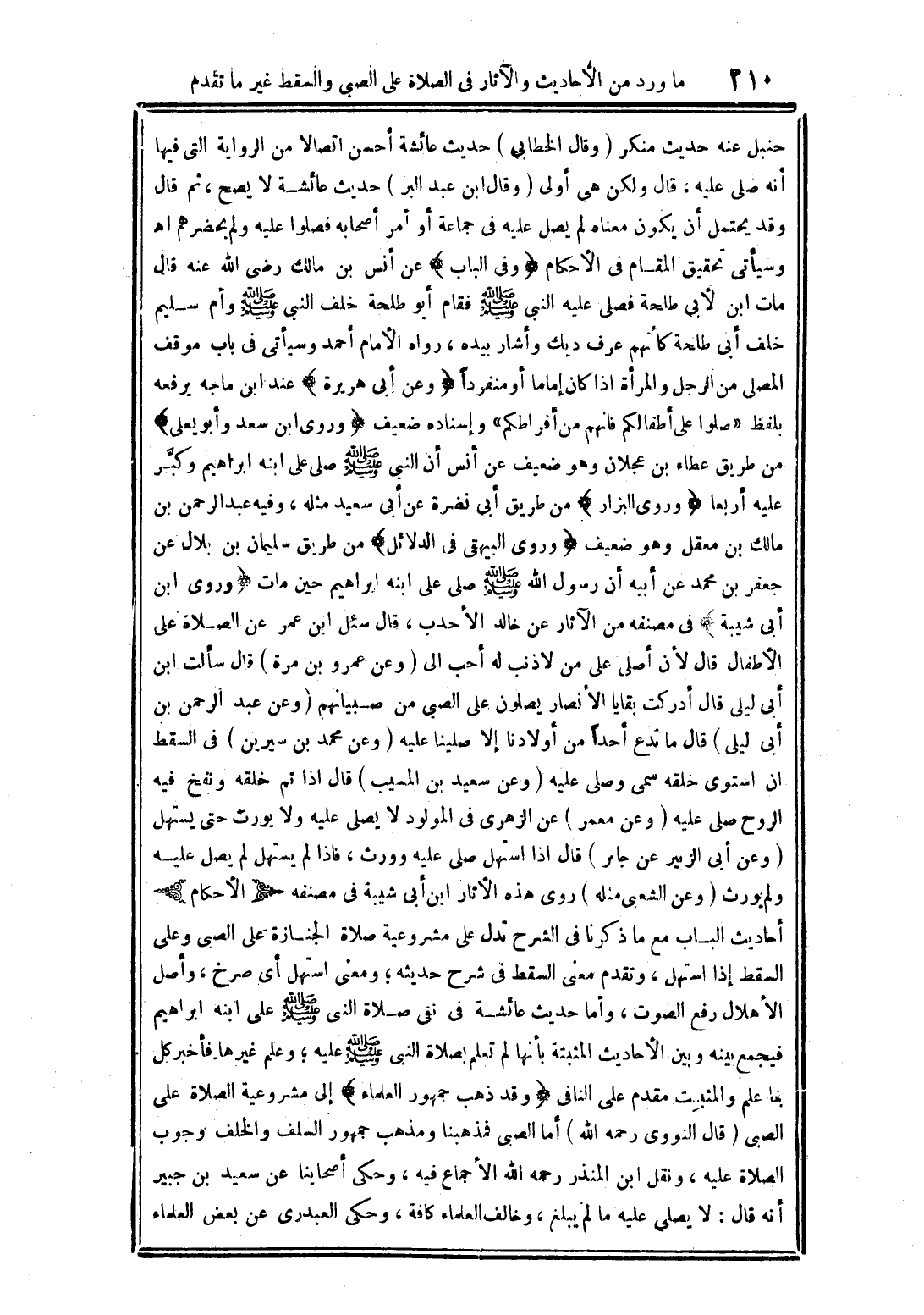 حنبل عنه حديث منكر (وقال الخطابى) حديث عائشة أحسن اتصالا من الرواية التى فيها انه صلى عليه: قال ولكن هى أولى (وقال ابن عبد البر) حديث عائشة لا يصح , ثم قال وقد يحتمل أن يكون معناه لم يصل عليه فى جماعة أو أمر أصحابه فصلوا عليه ولم يحضرهم أهـ وسيأتى تحقيق المقام فى الأحكام (وفى الباب) عن أنس بن مالك رضى الله عنه قال مات ابن لأبى طلحة فصلى عليه النبى صلى الله عليه وسلم فقال أبو طلحة خلف النبى صلى الله عليه وسلم وأم سليم خلف أبى طلحة كأنهم عرف ديك وأشار بيده , رواه الأمام أحمد وسيأتى فى باب موقف المصلى من الرجل والمرأة اذا كان إماما أو منفردا (وعن أبى هريرة) عند ابن ماجه برفعه بلفظ (صلوا على أطفالكم فأنهم من أفراطكم) وإسناده ضعيف (وروى ابن سعد وأبويعلى) من طريق عطاء بن عجلان وهو ضعيف عن أنس أن النبى صلى الله عليه وسلم صلى على ابنه ابراهيم وكبر عليه أربعا (وروى البزار) من طريق أبى نضرة عن ابى سعيد منله, وفيه عبد الرحمن بن مالك بن معقل وهو ضعيف (وروى البيهقى فى الدلائل) من طريق سليمان بن بلال عن جعفر بن محمد عن أبيه أن رسول الله صلى الله عليه وسلم صلى على ابنه ابراهيم حين مات (وروى ابن أبى شيبة) فى مصنفه من الاثار عن خالد الأحدب , قال سئل ابن عمر عن الصلاة على الأطفال قال لأن أصلى على من لا ذنب له أحب الى (وعن عمرو بن مرة) قال سألت ابن أبى ليلى قال أدركت بقايا الأنصار يصلون على الصبى من صبيانهم (وعن عبد الرحمن بن أبى ليلى) قال ما تدع أحدا من أولادنا إلا صلينا عليه (وعن محمد بن سيرين) فى السقط ان استوى خلقه سمى وصلى عليه (وعن سعيد بن المسيب) قال اذا تم خلقه ونفخ فيه الروح صلى عليه (وعن معمر) عن الزهى فى المولود لا بصلى عليه ولا يورث حتى يستهل (وعن أبى الزبير عن جابر) قال اذا استهل صلى عليه وورث , فاذا لم يستهل لم يصل عليه ولم يورث (وعن الشعبى منله) روى هذه الأثار ابن أبى شيبة فى مصفه (الأحكام) أحاديث الباب مع ما ذكرنا فى الشرح تدل على مشروعية صلاة الجنازة على الصبى وعلى السقط إذا استهل , وتقدم معى السقط فى شرح حديثه؛ ومعنى استهل أى صرخ , وأصل الأهلال رفع الصوت, وأما حديث عائشة فى نفى صلاة النبى صلى الله عليه وسلم على ابنه ابراهيم فيجمع بينه وبين الأحاديث المئبتة بأنها لم تعلم بصلاة النبى صلى الله عليه وسلم عليه؛ وعلم غيرها. فأخبر كل بما علم والمنبت مقدم على النافى (وقد ذهب جمهور العلماء) إلى مشروعية الصلاة على الصبى (قال النووى رحمه الله) أما الصبى فمذهبنا ومذهب جمهور السلف والخلف وجوب الصلاة عليه , ونقل ابن المنذر رحمه الله الأجماع فيه , وحكى اصحابنا عن سعيد بن جبير أنه قال: لا يصلى عليه ما لم يبلغ , وخالف العلماء كافة , وحكى العبدري عن بعض العلماء