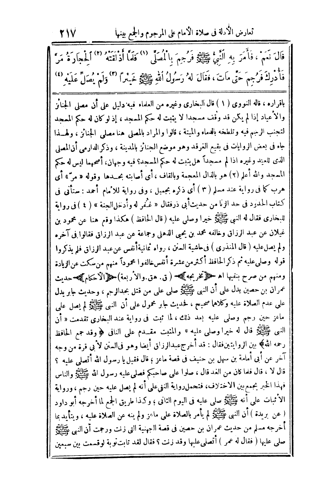 بإقراره , قال النووي (1) قال البخارى وغيره من العلماء فيه دليل على أن مصلى الجنائز والأعياد إذا لم يكن قد وقف مسجدا لا يثبت له حكم المسجد , إذ لو كان له حكم المسجد لتجنب الرجم فيه وتلطخه بالدماء والميتة , قالوا والمراد بالمصلى هنا مصلى الجنائز , ولهذا جاء فى بعض الروايات فى بقيع الغرقد وهو موضع الجنائز بالمدينة , وذكر الدرامى أن المصلى الذى للعيد وغيره اذا لم مسجدا هل يثبت له حكم المسجد؟ فيه وجهان , أصحهما ليس له حكم السمجد والله أعلم (2) هو بالذال المعجمة وبالقاف, أى أصابته يحسدها وقوله (مر) أى هرب كما فى رواية عند مسلم (3) أى ذكره بجميل , وفى رواية للأمام أحمد: ستأتى فى كتاب الحدود فى حد الزنا من حديث أبى ذر فقال (غفر له وأدخل الجنه) (4) فى رواية للبخارى فقال له النبى صلى الله عليه وسلم خيرا وصلى عليه (قال الحافظ) هكذا وقع هنا عن محمود بن غيلان عن عبد الرزاق وخالفه محمد بن يحيى الذهلى وجماعة عن عبد الرزاق فقالوا فى اخره ولم يصل عليه (قال المنذرى) فى حاشية الحنن , رواه ثمانية أنفس عن عبد الرزاق فلم يذكروا قوله وصلى عليه ثم ذكر الحافظ أكثر من عشرة أنفس خالفوا محمودا منهم من سكت عن الزيادة ومنهم من صرح نبفيها أهـ (تخريجه) (ق. هق. والأربعة) (الأحكام) حديث عمر ان بن حصين يدل على أن النبى صلى الله عليه وسلم صلى عليه من قتل بحد الرجم , وحديث جابر يدل على عدم الصلاة عليه وكلاهما صحيح , فحديث جابر محمول على أن النبى صلى الله عليه وسلم لم يصل على ماعز حين رجم وصلى عليه بعد ذلك , لما ثبت فى رواية عند البخارى تقدمت (أن النبى صلى الله عليه وسلم قال له خيرا وصلى عليه) والمثبت مقدم على النافى (وقد جمع الحافظ رحمه الله) بين الروايتين فقال: قد أخرج عبد الرزاق أيضا وهو فى السنن لأبى قرة من وجه قال لأ , قال قلما كان من الغد قال , صلوا على صاحبكم فصلى عليه رسول الله صلى الله عليه وسمل والناس فهذا الخبر يجمع بني الاختلاف , فتحمل رواية النفى على أنه لم يصل عليه حين رجم , ورواية الأثبات على أنه صلى الله عليه وسلم صلى عليه فى اليوم الثانى، وكذا طريق الجمع لما أخرجه أبو داود (عن بريدة) أن النبى صلى الله عليه وسلم لم يأمر بالصلاة على ماعز ولم ينه عن الصلاة عليه , وبتأيد بما أخرجه مسلم من حديث عمران بن حصين فى قصة الجهنية التى زنت ورجمت أن النبى صلى الله عليه وسلم صلى عليها (فقال له عمر) أتصلى عليها وقد زنت؟ فقال لقد تابت توبة لو قسمت بين سبعين