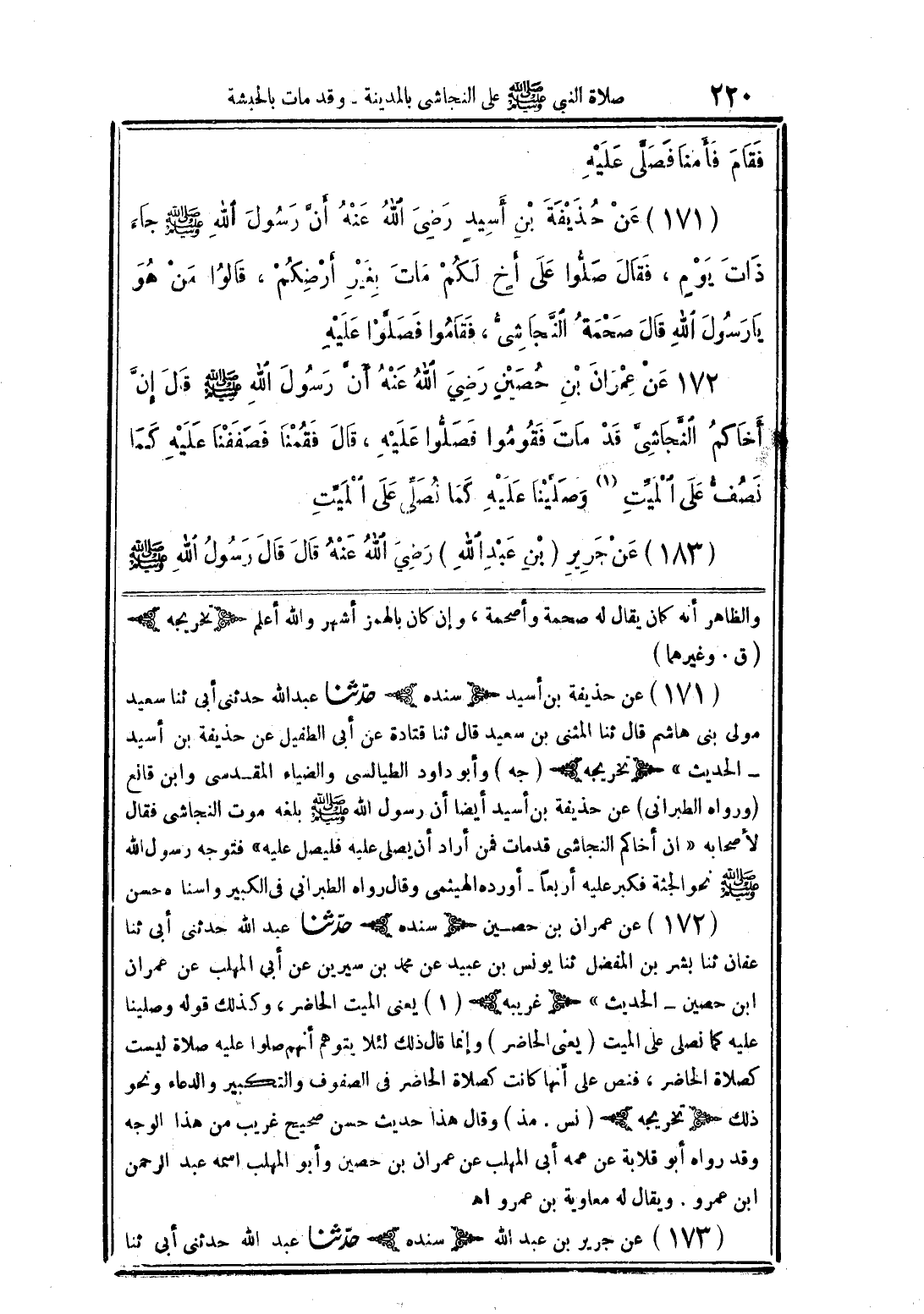 (171) عن حذيفة بن أسيد رضي الله عنه أن رسول الله صلى الله عليه وسلم جاء ذات يومٍ، فقال صلُّوا على أخٍ لكم مات بغير أرضكم، قالوا من هو يا رسول الله قال صحمة النَّجاشيُّ، فقاموا فصلَّوا عليه