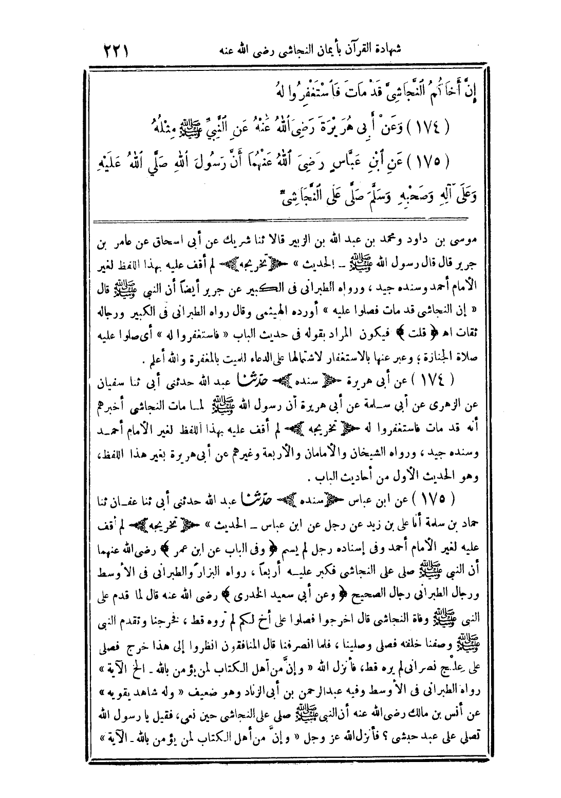 (175) عن ابن عبَّاسٍ رضي الله عنهما أنَّ رسول الله صلى الله عليه وعلى آله وصحبه وسلم صلَّى على النَّجاشيّ