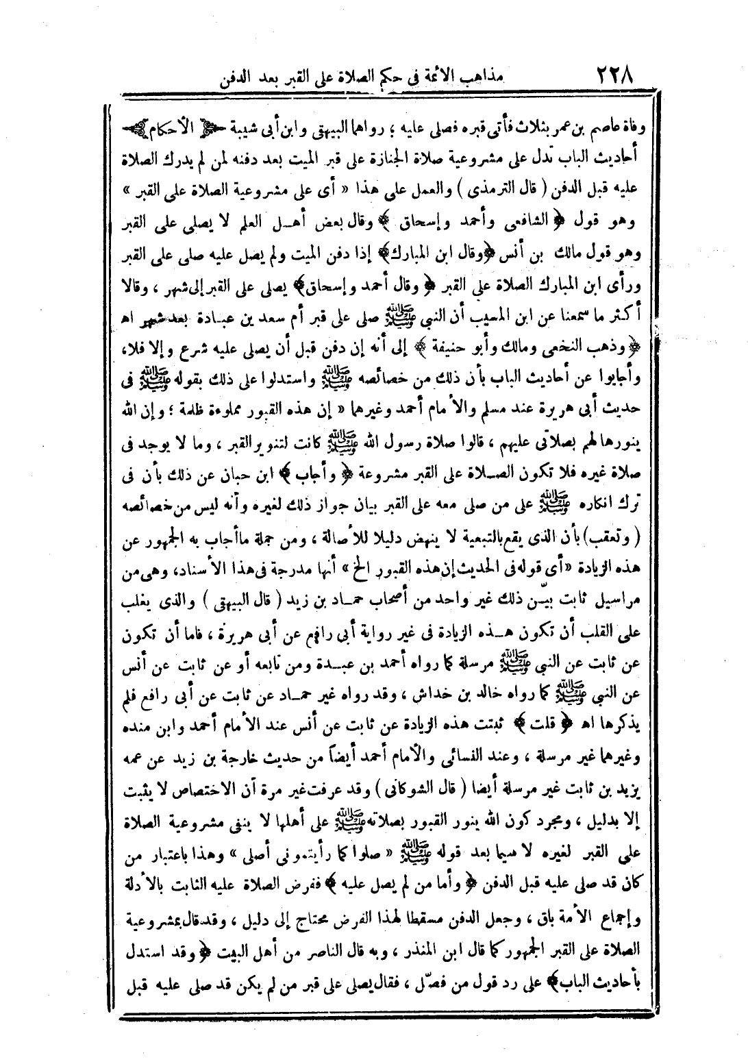 وفاة عاصم بن عمر بثلاث فأتى قبره فصلى عليه؛ رواهما البيهقي وابن أبى شيبة (الأحكام) أحاديث الباب تدل على مشروعية صلاة الجنازة على قبر الميت بعد دفنه لمن لم يدرك الصلاة عليه قبل الدفن (قال الترمذى) والعمل على هذا "أي على مشروعية الصلاة على القبر" وهو قول (الشافعى وأحمد وإسحاق) وقال بعض أهل العلم لا يصلى على القبر وهو قول مالك بن أنس (وقال ابن المبارك) إذا دفن الميت ولم يصل عليه صلى على القبر ورأى ابن المبارك الصلاة على القبر (وقال أحمد وإسحاق) يصلى على القبر إلى شهر، وقالا أكثر ما سمعنا عن ابن المسيب أن النبي صلى الله عليه وسلم صلى على قبر أم سعد بن عبادة بعد شهر اهـ (وذهب النخعى ومالك وأبو حنيفة) إلى أنه إن دفن قبل أن يصلى عليه شرع وإلا فلا، وأجابوا عن أحاديث الباب بأن ذلك من خصائصه صلى الله عليه وسلم واستدلوا على ذلك بقوله صلى الله عليه وسلم في حديث أبى هريرة عند مسلم والأمام أحمد وغيرهما "إن هذه القبور مملؤة ظلمة؛ وإن الله ينورها بصلاتى عليهم، قالوا صلاة رسول الله صلى الله عليه وسلم كانت لتنوير القبر، وما لا يوجد في صلاة غيره فلا تكون الصلاة على القبر مشروعة (وأجاب) ابن حبان عن ذلك بأن في ترك انكاره صلى الله عليه وسلم على من صلى معه القبر بيان جاوز ذلك لغيره وأنه ليس من خصائصه (وتعقب) بأن الذي يقع بالتبعية لا ينهض دليلاً للصالة، ومن جملة ما أجاب به الجمهور عن هذه الزيادة "أي قوله في الحديث إن هذه القبور الخ" أنها مدرجة في هذا الأسناد، وهى من مراسيل ثابت بيّن ذلك غير واحد من أصحاب حماد بن زيد (قال البيهقى) والذى يغلب على القلب أن تكون هذه الزيادة في غير رواية أبى رافع عن ابى هريرة، فاما أن تكون عن ثابت عن النبي صلى الله عليه وسلم مرسلة كما رواه أحمد بن عبدة ومن تابعه أو عن ثابت عن أنس عن النبي صلى الله عليه وسلم كما رواه خالد بن خداش، وقد رواه غير حماد عن ثابت عن ابى رافع فلم يذكرها اهـ (قلت) ثبتت هذه الزيادة عن ثابت عن أنس عند الأمام أحمد وابن منده وغيرهما غير مرسلة، وعند النسائى والأمام أحمد أيضاً من حديث خارجة بن زيد عن عمه يزيد بن ثابت غير مرسلة أيضاً (قال الشوكانى) وقد عرفت غير مرة أن الاختصاص لا يثبت إلا بدليل، ومجرد كون الله ينور القبور بصلاته صلى الله عليه وسلم على أهلها لا ينفى مشروعية الصلاة على القبر لغيره لاسيما بعد قوله صلى الله عليه وسلم "صلوا كما رايتمونى أصلى" وهذا باعتبار من كان قد صلى عليه قبل الدفن (وأما من لم يصل عليه) ففرض الصلاة عليه الثابت بالأدلة وإجماع الأمة باق، وجعل الدفن مسقطاً لهذا الفرض محتاج إلى دليل، وقد قال بمشروعية الصلاة على القبر الجمهور كما قال ابن المنذر، وبه قال الناصر من أهل البيت (وقد استدل بأحاديث الباب) على رد قول من فصّل، فقال يصلى على قبر من لم يكن قد صلى عليه قبل