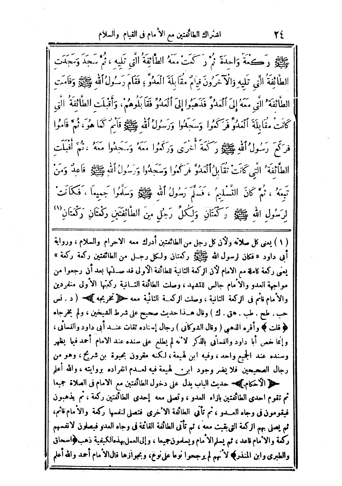 (1) يعني كل صلاته ولأن كل رجل من الطائفتين أدرك معه الاحرام والسلام، ورواية أبى داود "فكان لرسول الله صلى الله عليه وسلم ركعتان ولكل رجل من الطائفتين ركعة ركعة" يعنى ركعة كاملة مع الامام لأن الركعة الثانية للطائفة الأولى قد صلتها بعد أن رجعوا من مواجهة العدو والأمام جالس للتشهد، وصلت الطائفة الثانية ركعتها الأولى منفردين والأمام قائم فى الركعة الثانية، وصلت الركعة الثانية مع (تخريجه) (د. نس. حب. طح. طب. هق. ك) وقال هذا حديث صحيح على شرط الشيخين، ولم يخرجاه (قلت) وأقره الذهبى (وقال الشوكانى) رجال إسناده ثقات عند أبى داود والنسائى، وإنما خص أبا داود والنسائى بالذكر لأنه لم يطلع على سنده عند الامام أحمد فيما يظهر وسنده عند الجميع واحد، وفيه ابن لهيعة، لكنه مقرون بحيوة بن شريح، وهو من رجال الصحيحين فلا يضر وجود ابن لهيعة فيه لعدم انفراده بروايته، والله أعلم