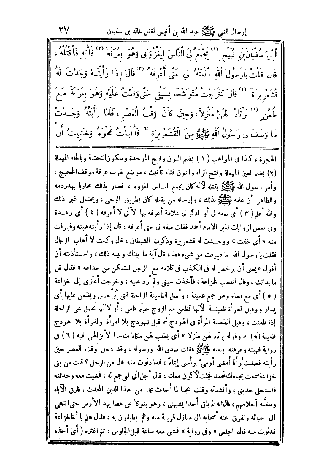 الهجرة، كذا فى المواهب (1) بضم النون وفتح الموحدة وسكون التحتية وبالحاء المهملة (2) بضم العين المهملة وفتح الراء والنون فتاء تأنيث، موضع بقرب عرفة موقف الحجيج، وأمر رسول الله صلى الله عليه وسلم بقتله لأنه كان يجمع الناس لغزوة، فصار بذلك محاربا يهدر دمه والظاهر أن علمه صلى الله عليه وسلم بذلك، وإرساله من يقتله كان بطريق الوحى، ويحتمل غير ذلك والله أعلم (3) أى صفة لى أو اذكر لى علامة أعرفه بها لأنى لا أعرفه (4) أى رعدة وفى بعض الروايات لغير الامام أحمد فقلت صفه لى حتى أعرفه، قال إذا رأيته هبته وفرقت منه "أى خفت" ووجدت له قشعريرة وذكرت الشيطان، قال وكنت لا أهاب الرجال فقلت يا رسول الله ما فرقت من شيء قط، قال آية ما بينك وبينه ذلك، واستأذنته أن أقول "يعنى أن يرخص له فى الكذب فى كلامه مع الرجل ليتمكن من خداعه" فقال قل ما بدالك، وقال انتسب لخزاعة، فأخذت سيفى ولم أزد عليه، وخرجت أعتزى إلى خزاعة (5) أى مع نساء وهو جمع ظعينة، وأصل الظعينة الراحلة التى يرحل ويظعن عليها أى يسار؛ وقيل للمرأة ظعينة لأنها تظعن مع الزوج حيثما ظعن، أو لأنها تحمل على الراحلة إذا ظعنت، وقيل الظعينة المرأة فى الهودج ثم قيل للهودج بلا امرأة وللمرأة بلا هودج ظعينة (نه) "وقوله يرتاد لهن منزلا" أى يطلب لهن مكانا مناسبا لأنزالهن فيه (6) فى رواية فهبته وعرفته بنعته صلى الله عليه وسلم فقلت صدق الله ورسوله، وقد دخل وقت العصر حين رأيته فصليت وأنا أمشى أومئ برأسى إيماء، فلما دنوت منه قال من الرجل؟ قلت من بنى خزاعة سمعت بجمعك لمحمد فجئت لأكون معك، قال أجل انى لفى جمع له، فمشيت معه وحدثته فاستحلى حديثى؛ وأنشدته وقلت عجبا لما أحدث محمد من هذا الدين المحدث، فارق الآباء وسفَّه أحلامهم، قال انه لم يلق أحدا يشبهنى، وهو يتوكأ على عصا يهد الأرض حتى انتهى الى خبائه وتفرق عنه أصحابه الى منازل قريبة منه وهم يطيفون به، فقال هلم يا أخا خزاعة فدنوت منه قاله اجلس "وفى رواية" فمشى معه ساعة قبل الجلوس، ثم اغتره (أي أخذه