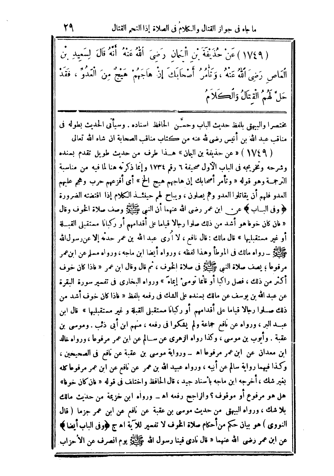 (1749) عن حذيفة بن اليمان رضي الله عنه أنَّه قال لسعيد بن العاص رضي الله عنه، وتأمر أصحاب إن هاجهم هيج من العدوِّ، فقد حلَّ لهم القتال والكلام