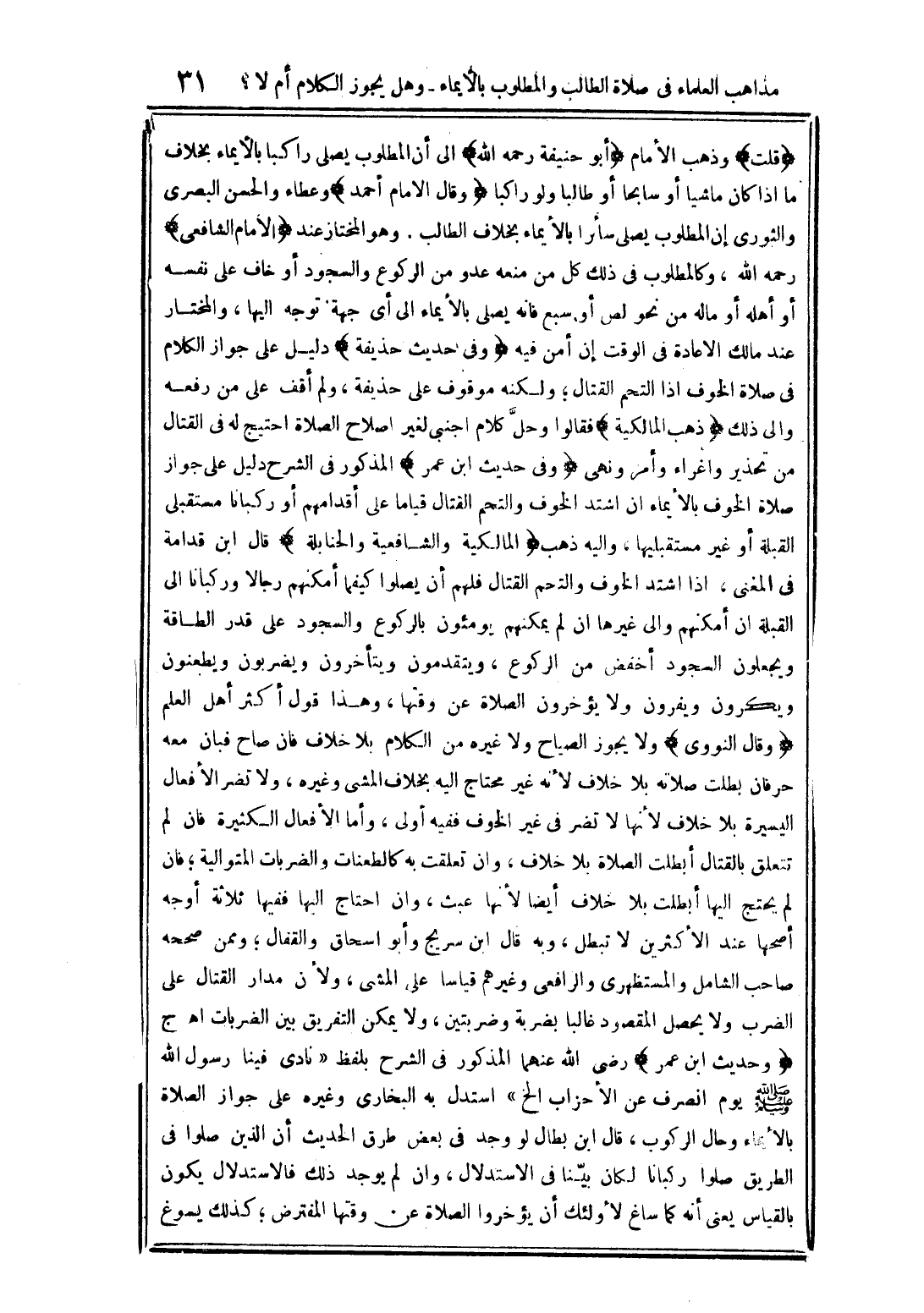 (قلت) وذهب الإمام (أبو حنيفة رحمه الله) الى أن المطلوب يصلى راكبا بالأيماء بخلاف ما اذا كان ماشيا أسابحا أو طالبا ولو راكبا (وقال الامام أحمد) وعطاء والحسن البصرى والثورى إن المطلوب يصلى سائرا بالأيماء بخلاف الطالب. وهو المختاز عند (الأمام الشافعى) رحمة الله، وكالمطلوب فى ذلك كل من منعة عدو من الركوع والسجود أو خاف على نفسه أو أهله أو ماله من نحو أو سبع فانه يصلى بالأيماء الى أى جهة توجه اليها، والمختار عند مالك الاعادة فى الوقت إن أمن فيه (وفى حديث حذيفة) دليل على جواز الكلام فى صلاة الخوف اذا التحم القتال؛ ولكنه موقوف على حذيفة، ولم أقف على من رفعه والى ذلك (ذهب المالكية) فقالوا وحلَّ كلام اجنبى لغير اصلاح الصلاة احتيج له فى القتال من تحذير واغراء وأمر ونهى (وفى حديث ابن عمر) المذكور فى الشرح دليل على جواز صلاة الخوف بالأيماء ان اشتد الخوف والتحم القتال قياما على أقدامهم أو ركبانا مستقبلى القبلة أو غير مستقبليها، واليه ذهب (المالكية والشافعية والحنابلة) قال ابن قدامة فى المغنى، اذا اشتد الخوف والتحم القتال فلهم أن يصلوا كيفما أمكنهم رجالا وركبانا الى القبلة ان أمكنهم والى غيرها ان لم يمكنهم يومئون بالركوع والسجود على قدر الطاقة ويجعلون السجود أخفض من الركوع، ويتقدمون ويتأخرون ويضربون ويطعنون ويكرون ويفرون ولا يؤخرون الصلاة عن وقتها، وهذا قول أكثر أهل العلم (وقال النووى) ولا يجوز الصياح ولا غيره من الكلام بلا خلاف فان صاح فبان معه حرفان بطلت صلاته بلا خلاف لأنة غير محتاج الية بخلاف المشى وغيره، ولا تضر الأفعال اليسيرة بلا خلاف لأنها لا تضر فى غير الخوف ففيه أولى، وأما الأفعال الكثيرة فان لم تتعلق بالقتال أبطلت الصلاة بلا خلاف، وان تعلقت به كالطعنات والضربات المتوالية؛ فان لم يحتج اليها أبطلت بلا خلاف أيضا لأنها عبث، وان احتاج اليها ففيها ثلاثة أوجه أصحها عند الأكثرين لا تبطل، وبه قال ابن سريج وأبو اسحاق والقفال؛ وممن صححه صاحب الشامل والمستظهرى والرافعى وغيرهم قياسا على المشى، ولأن مدار القتال على الضرب ولا يحصل المقصود غالبا بضربة وضربتين، ولا يمكن التفريق بين الضربات اهـ ج (وحديث ابن عمر) رضى الله عنهما المذكور فى الشرح بلفظ "نادى فينا رسول الله صلى الله عليه وسلم يوم انصرف عن الأحزاب الخ" استدل به البخارى وغيره على جواز الصلاة بالأيماء وحال الركوب، قال ابن بطال لو وجد فى بعض طرق الحديث أن الذين صلوا فى الطريق صلوا ركبانا لكان بيّنا فى الاستدلال، وان لم يوجد ذلك فالاستدلال يكون بالقياس يعنى أنه كما ساغ لأولئك أن يؤخروا الصلاة عن وقتها المفترض؛ كذلك يسوغ