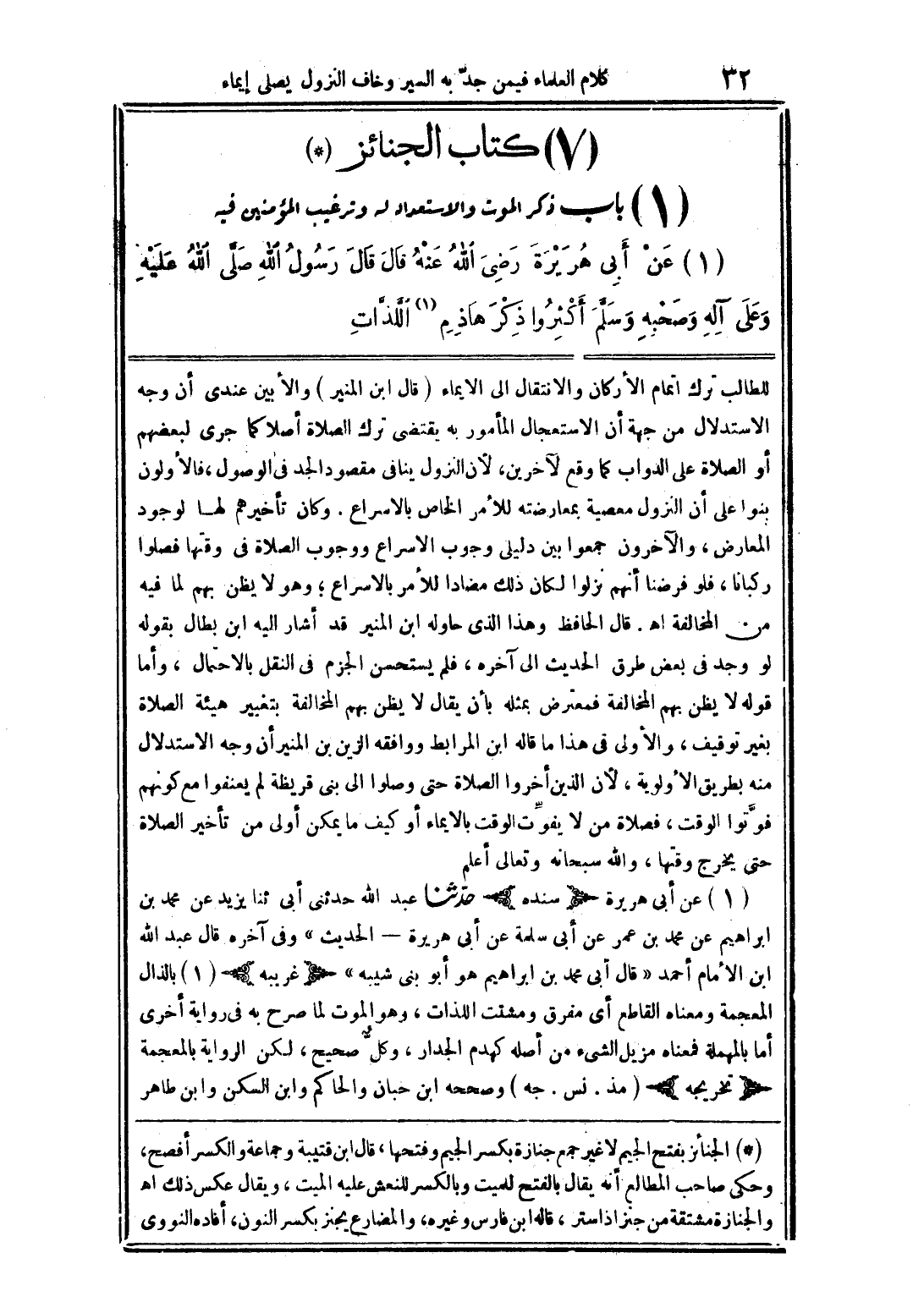 (*) الجنائز بفتح الجيم لا غير جمع جنازة بكسر الجيم وفتحها، قال ابن قتيبة وجماعة والكسر أفصح، وحكى صاحب المطالع أنه يقال بالفتح للميت وبالكسر للنعش عليه الميت، ويقال عكس ذلك اهـ والجنازة مشتقة من جنزاذاستر، قاله ابن فارس وغيره، والمضارع يجنز بكسر النون، أفاده النووي