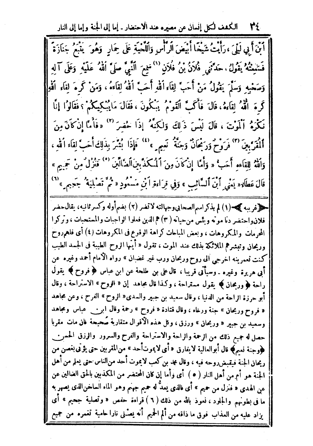 ابن أبي ليلى، رأيت شيخًا أبيض الرَّأس واللِّحية على حمارٍ وهو يتبع جنازةً فسمعته يقول، حدَّثني فلان بن فلانٍ سمع النَّبيِّ صلَّى الله عليه وعلى آله وصحبه وسلَّم يقول من أحبَّ لقاء الله أحبَّ الله لقاءه، ومن كره لقاء الله كره الله لقاءه، قال فأكبَّ القوم يبكون، فقال ما يبكيكم؟ فقالوا إنَّا نكره الموت، قال ليس ذلك ولكنَّه إذا حضر {فأمَّا إن كان من المقرَّبين فروحٌ وريحانٌ وجنَّة وجنَّة نسيمٍ} فإذا بشِّر بذلك أحبَّ لقاء الله، والله للقاءه أحبُّ {وأما إن كان من المكذِّبين الضَّالِّين فننزل من حميمٍ} قال عطاء {يعني ابن السَّائب} وفي قراءة ابن مسعودٍ {ثمَّ تصليه جحيمٍ}