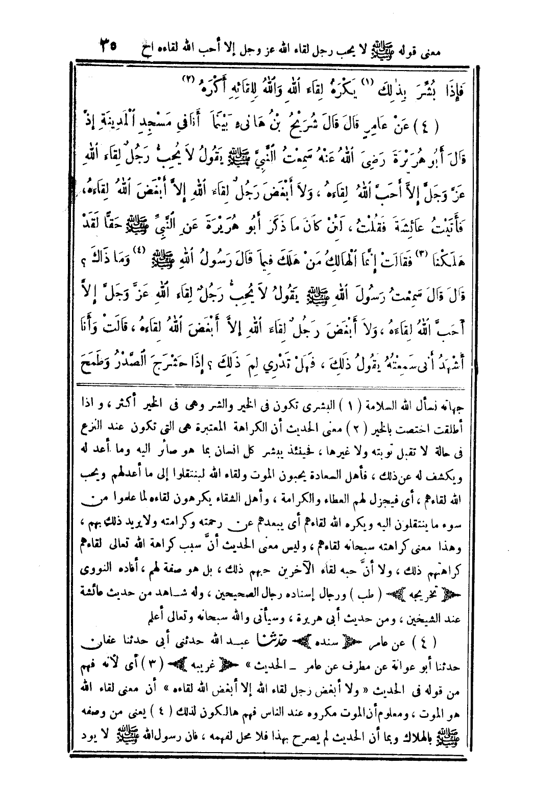 (4) عن عامر (سنده) حدّثنا عبد الله حدثنى أبى حدثنا عفان حدثنا أبو عوانة عن مطرف عن عامر الحديث" (غريبه) (3) أى لأنه فهم من قوله فى الحديث "ولا أبغض رجل لقاء الله إلا أبغض الله لقاءه" أن معنى لقاء الله هو الموت، ومعلوم أن الموت مكروه عند الناس فهم هالكون لذلك (4) يعنى من وصفه صلى الله عليه وسلم بالهلاك وبما أن الحديث لم يصرح بهذا فلا محل لفهمه، فان رسول الله صلى الله عليه وسلم لا يود