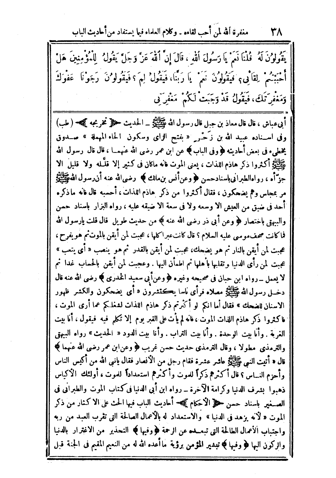 يقولون له قُلنا نعم يا رسول الله، قال إنَّ الله عزَّ وجلَّ يقول للمؤمنين هل أحببتهم لقائي؟ فيقولون نعم يا ربَّنا، فيقول لِمَ؟ فيقولون رجونا عفوك ومغفرتك، فيقول قد وجبت لكم مغفرتي