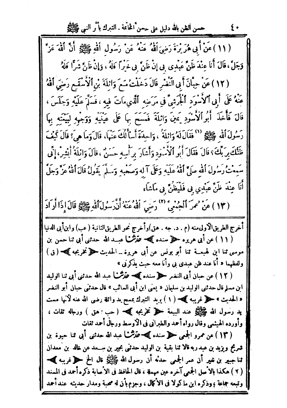 (11) عن أبي هريرة رضي الله عنه عن رسول الله صلَّى الله عليه وسلم أنَّ الله عزَّ وجلَّ، قال أنا عند ظنَّ عبدي بي إن ظنَّ بي خيرًا فله، وإن ظنَّ شرًا فله