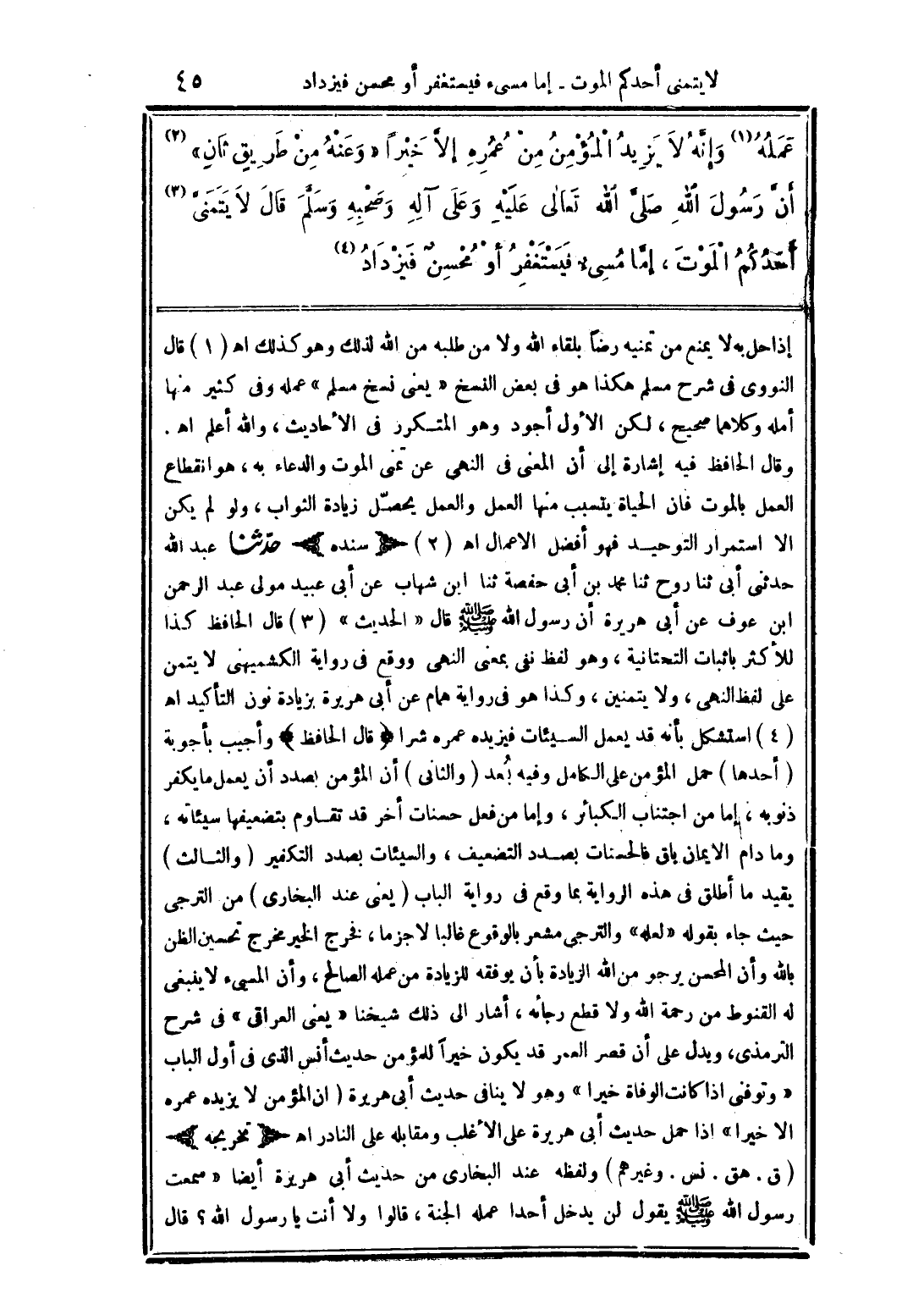 عمله وإنَّه لا يزيد المؤمن من عمره إلَّا خيرًا {وعنه من طريقٍ ثانٍ} أنَّ رسول الله صلَّى الله تعالى عليه وعلى وآله وصحبه وسلَّم قال لا يتمنَّى أحدكم الموت، إ مَّا مُسيءٌ فيستغفر أو مُحسنٌ فيزداد