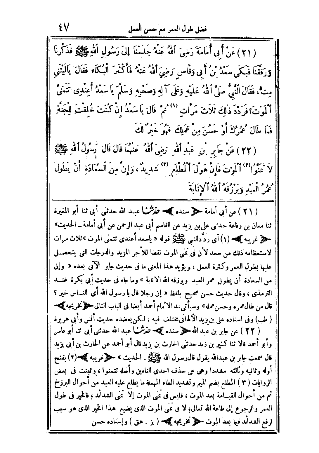 (22) عن جابر بن عبد الله رضي الله عنهما قال قال رسول الله صلَّى الله عليه وسلَّم لا تمنَّوا الموت فإنَّ هول المطَّلع شديدٌ، وإنَّ من السَّعادة أن يطول عمر العبد ويرزقه الله الإنابة