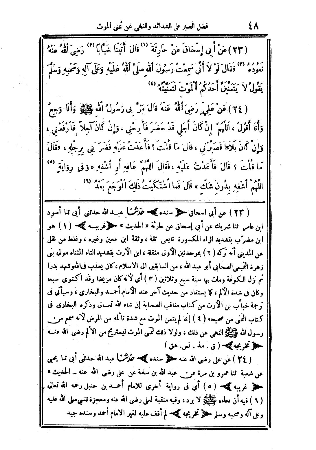 (23) عن أبي إسحاق عن حارثة قال أتينا خبَّابًا رضي الله عنه نعوده فقال لولا أنَّي سمعت رسول الله صلَّى الله عليه وعلى آله وصحبه وسلَّم يقول لا يتمنَّينَّ أحدكم الموت لتمنَّيته