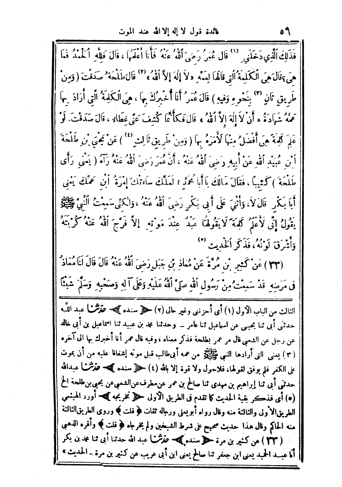 فذلك الذي دخلني قال عمر رضي الله عنه فأنا أعلمها، قال فلله الحمد فما هي؟ قال هي الكلمة التي قالها لعمِّه {لا إله إلَّا الله} قال طلعة صدقت (ومِن طريقٍ ثانٍ بنحوه وفيه) قال عمر أنا أخبرك بها، هي الكلمة التي أراد بها عمه شهادة {أن لا إله إلَّا الله} قال فكأنَّما كُشف عنِّي غكاء، قال صدقت. ل علم كلمة هي أفضل منها لأمره بها (ومن طريقٍ ثالثٍ) عن يحي بن طلحة ابن عبيد الله عن أبيه رضي الله عنه، أن عمر رضي الله عنه رآه (يعني رأي طلحة) كئيبًا، فقال مالك يا أبا محمَّد، لعلَّك ساءتك إمرة ابن عمَّك يعني أبا بكر قال لا، وأثنى على أبي بكر رضي الله عنه، ولكنِّي سمعت النَّبيِّ صلَّى الله عليه وسلَّم يقول إنِّي لأعلم كلمة لا يقولها عبدٌ عند موته إلَّا فرَّج الله عنه كربته وأشرق لونه، فذكر الحديث