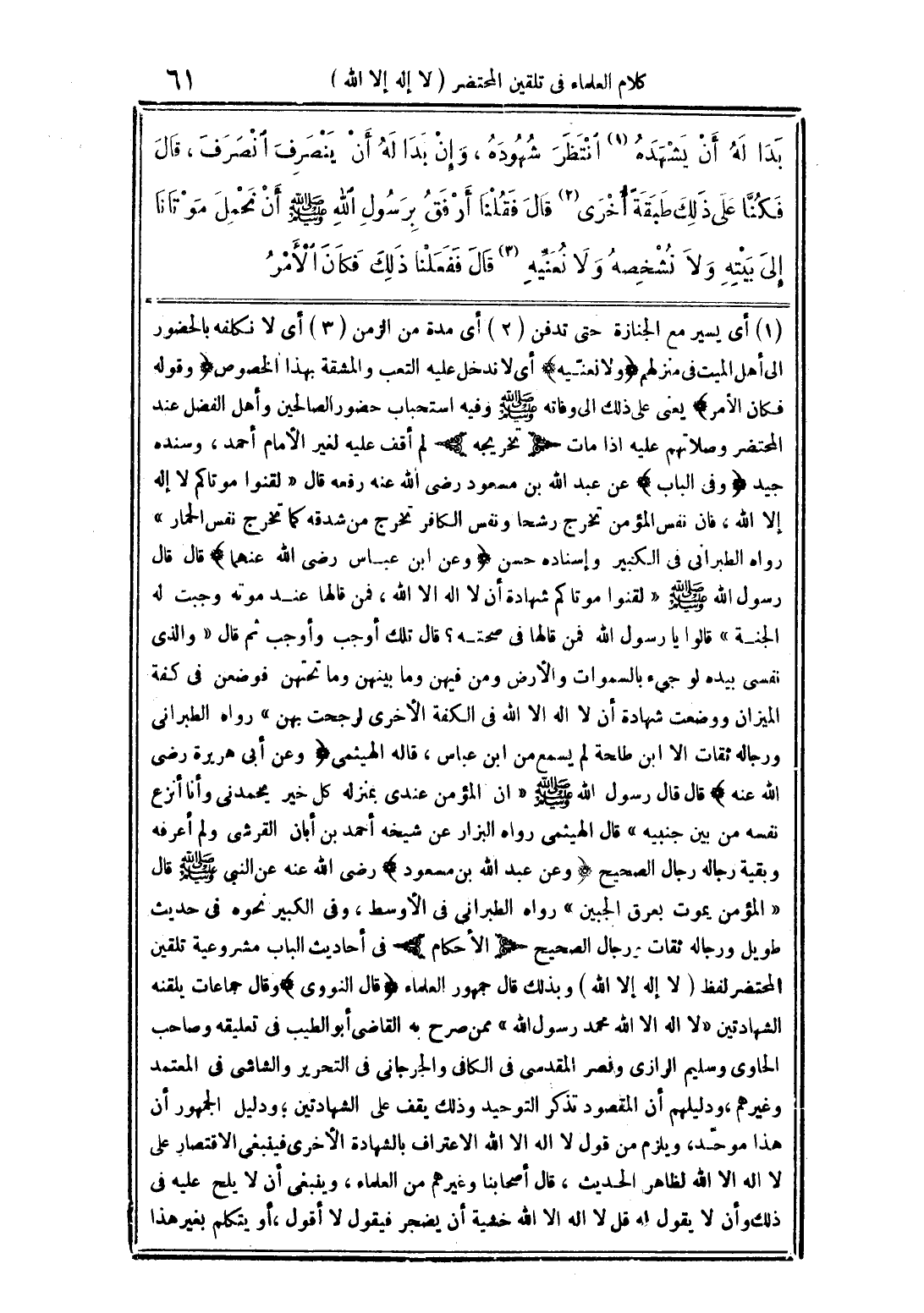 (1) أي يسير مع الجنازة حتى تدفن (2) أى مدة من الزمن (3) أى لا نكلفه بالحضور الى أهل الميت فى منزلهم (ولا نعنيه) أى لا ندخل عليه التعب والمشقة بهذا الخصوص (وقوله فكان الأمر) يعنى على ذلك الى وفاته صلى الله عليه وسلم وفيه استحباب حضور الصالحين وأهل الفضل عند المحتضر وصلاتهم عليه اذا مات (تخريجه) لم أقف عليه لغير الأمام أحمد، وسنده جيد (وفى الباب) عن عبد الله بن مسعود رضي الله عنه رفعه قال "لقنوا موتاكم لا إله إلا الله، فان نفس المؤمن تخرج رشحا ونفس الكافر تخرج من شدقه كما تخرج نفس الحمار" رواه الطبرانى فى الكبير وإسناده حسن (وعن ابن عباس رضي الله عنهما) قال قال رسول الله صلى الله عليه وسلم "لقنوا موتاكم شهادة أن لا اله الا الله، فمن قالها عند موته وجبت له الجنة" قالوا يا رسول الله فمن قالها فى صحته؟ قال تلك أوجب وأوجب ثم قال "والذى نفسى بيده لو جئ بالسموات والأرض ومن فيهن وما بينهن وما تحتهن فوضعن فى كفة الميزان ووضعت شهادة أن لا اله الا الله فى الكفة الأخرى لرجحت بهن" رواه الطبرانى ورجاله ثقات الا ابن طلحة لم يسمع من ابن عباس، قاله الهيثمي (وعن أبى هريرة رضي الله عنه) قال قال رسول الله صلى الله عليه وسلم "ان المؤمن عندى بمنزلة كل خير يحمدنى وأنا أنزع نفسه من بين جنبيه" قال الهيثمى رواه البزار عن شيخه أحمد بن أبان القرشى ولم أعرفه وبقية رجاله رجال الصحيح (وعن عبد الله بن مسعود) رضي الله عنه عن النبي صلى الله عليه وسلم قال "المؤمن يموت بعرق الجبين" رواه الطبراني فى الأوسط، وفى الكبير نحوه فى حديث طويل ورجاله ثقات ورجال الصحيح (الأحكام) فى أحاديث الباب مشروعية تلقين المحتضر لفظ (لا إله إلا الله) وبذلك قال جمهور العلماء (قال النووى) وقال جماعات يلقنه الشهادتين "لا اله الا الله محمد رسول الله" ممن صرح به القاضى أبو الطيب فى تعليقه وصاحب الحاوى وسليم الرازى ونصر المقدسى فى الكافى والجرجانى فى التحرير والشاشى فى المعتمد وغيرهم، ودليلهم أن المقصود تذكر التوحيد وذلك يقف على الشهادتين؛ ودليل الجمهور أن هذا موحد، ويلزم من قوله لا اله الا الله الاعتراف بالشهادة الأخرى فينبغي الاقتصار على لا اله الا الله لظاهر الحديث، قال أصحابنا وغيرهم من العلماء، وينبغى أن لا يلح عليه فى ذلك وأن لا يقول له قل لا اله الا الله خشية أن يضجر فيقول لا أقول، أو يتكلم بغير هذا