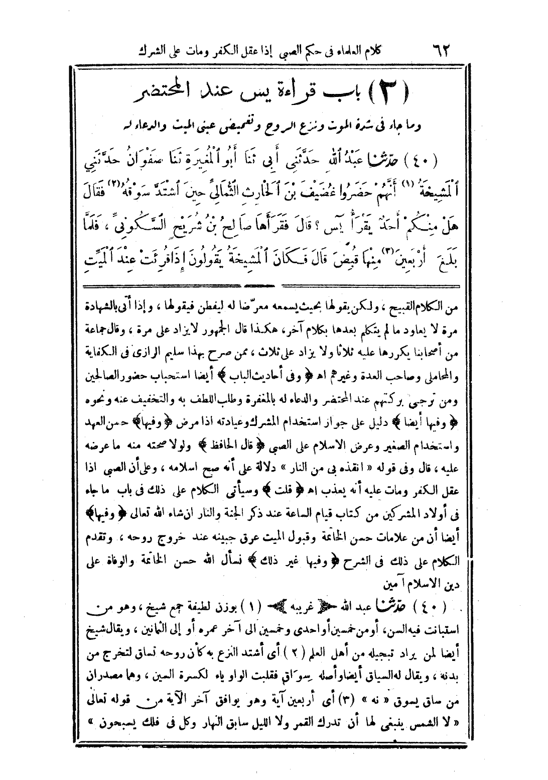 (40) حدّثنا عبد الله (غريبه) (1) بوزن لطيفة جمع شيخ، وهو من استبانت فيه السن، أو من خمسين أو احدى وخمسين الى آخر عمره أو إلى الثمانين، ويقال شيخ أيضا لمن يراد تبجيله من أهل العلم (2) أى أشتد النزع به كأن روحه تساق لتخرج من بدنه، ويقال له السياق أيضا وأصله سواق فقلبت الواو ياء لكسرة السين، وهما مصدران من ساق يسوق "نه" (3) أى أربعين آية وهو يوافق آخر الآية من قوله تعالى {لا الشمس ينبغى لها أن تدرك القمر ولا الليل سابق النهار وكل في فلك يسبحون"