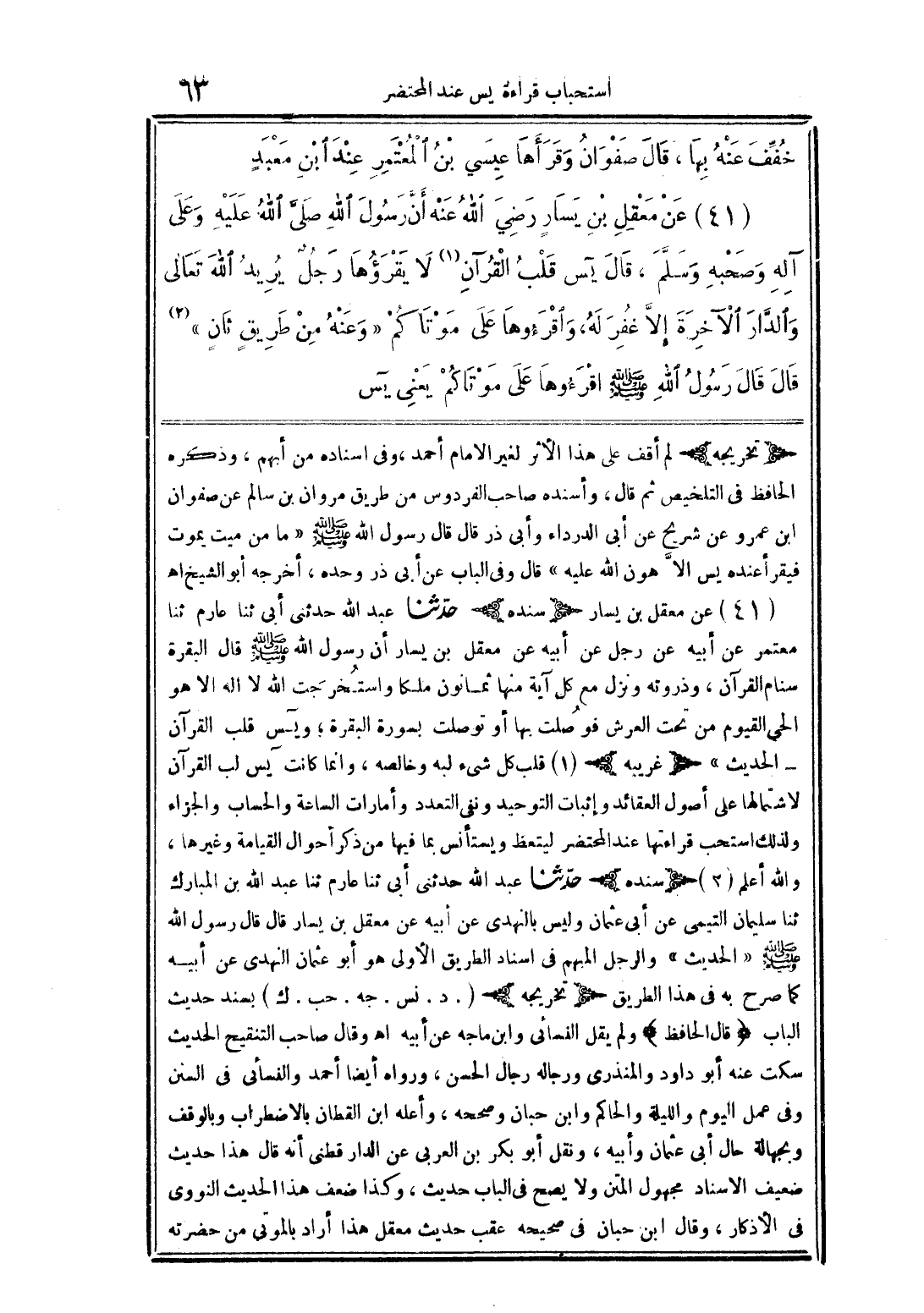 (41) عن معقل بن يسار رضى الله عنه أن رسول الله صلى الله عليه وعلى آله وصحبه وسلم، قال يس قلب القرآن لا يقرؤها رجل يريد الله تعالى والدار الآخرة إلا غفر له، واقرءوها على موتاكم "وعنه من طريق ثان"